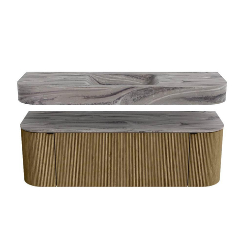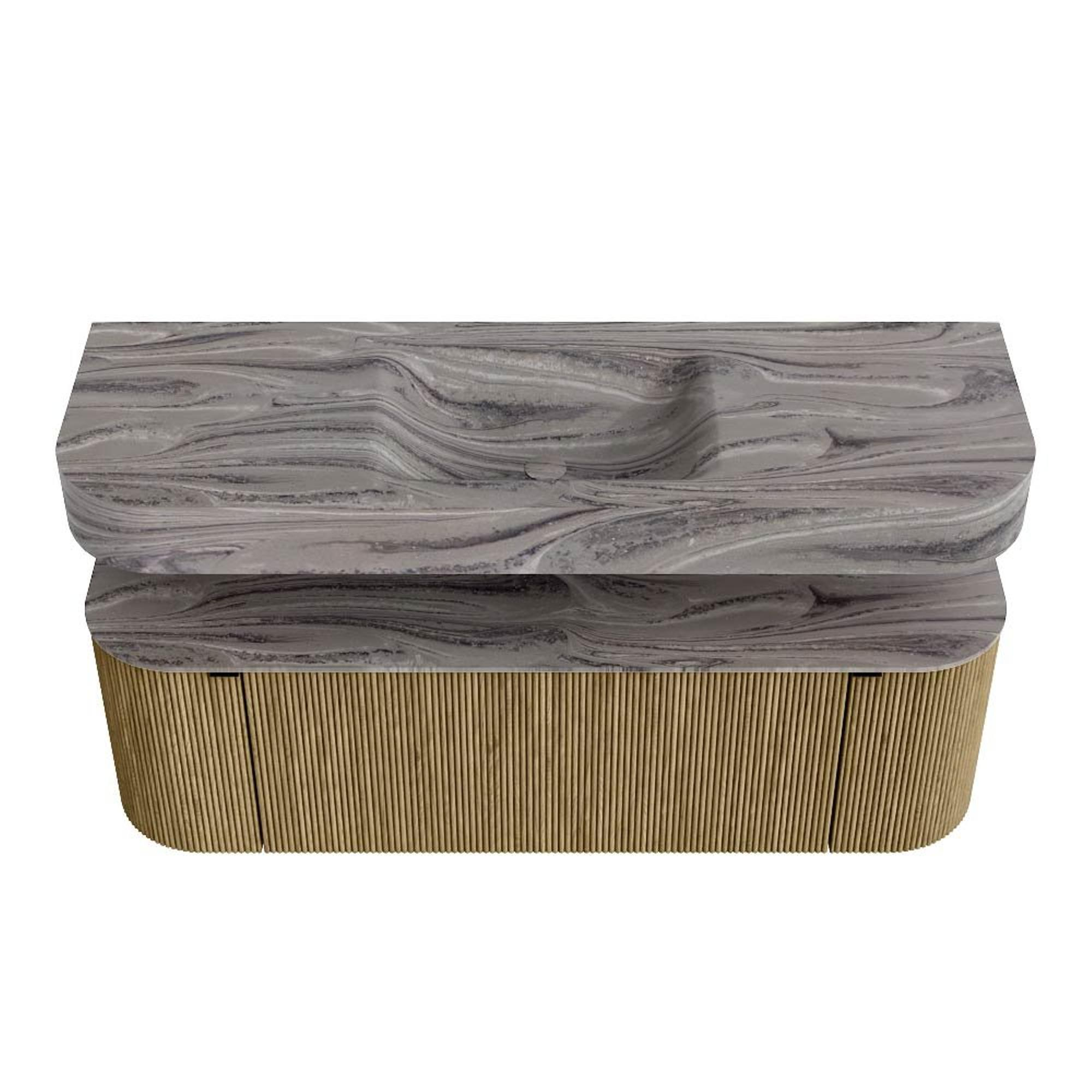 MONDIAZ THOR-DLUX 140cm meuble de salle de bains arrondi gauche + droite couleur Dusk avec 1 tiroir et 2 portes. Vasque suspendue CLOUD Milieu 1 trou de robinet couleur Sombra.