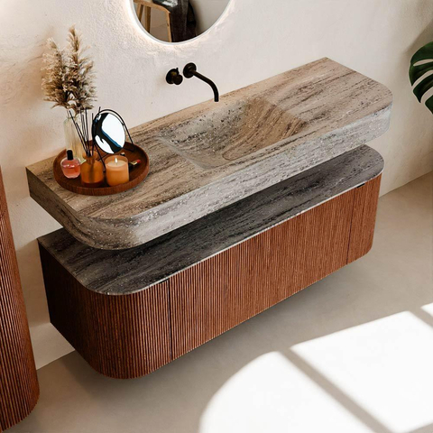 Matériaux naturels dans des tons chauds. Les nervures verticales apportent rythme et texture au design, tandis que le chêne confère une apparence chaleureuse et artisanale. Choisissez parmi 5 teintes de bois OAK, WALNUT, DUSK, SHADOW et RUBY, des couleurs de bois soigneusement sélectionnées pour enrichir les salles de bains modernes et classiques.