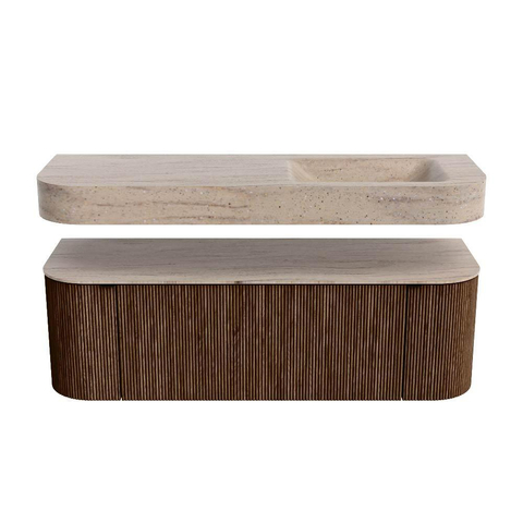 MONDIAZ THOR-DLUX 140cm meuble de salle de bains arrondi gauche + droite couleur Walnut avec 1 tiroir et 2 portes. Vasque suspendue CLOUD Droite 1 trou de robinet couleur Saba.