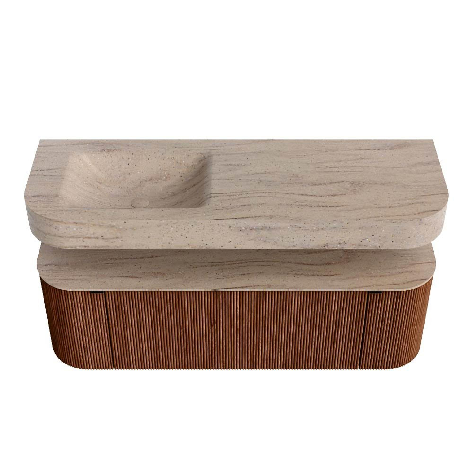MONDIAZ THOR-DLUX 140cm meuble de salle de bains arrondi gauche + droite couleur Ruby avec 1 tiroir et 2 portes. Vasque suspendue CLOUD Gauche 1 trou de robinet couleur Saba.