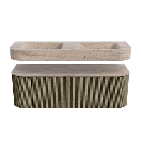 MONDIAZ THOR-DLUX 140cm meuble de salle de bains arrondi gauche + droite couleur Shadow avec 1 tiroir et 2 portes. Vasque suspendue CLOUD Double sans trou de robinet couleur Saba.