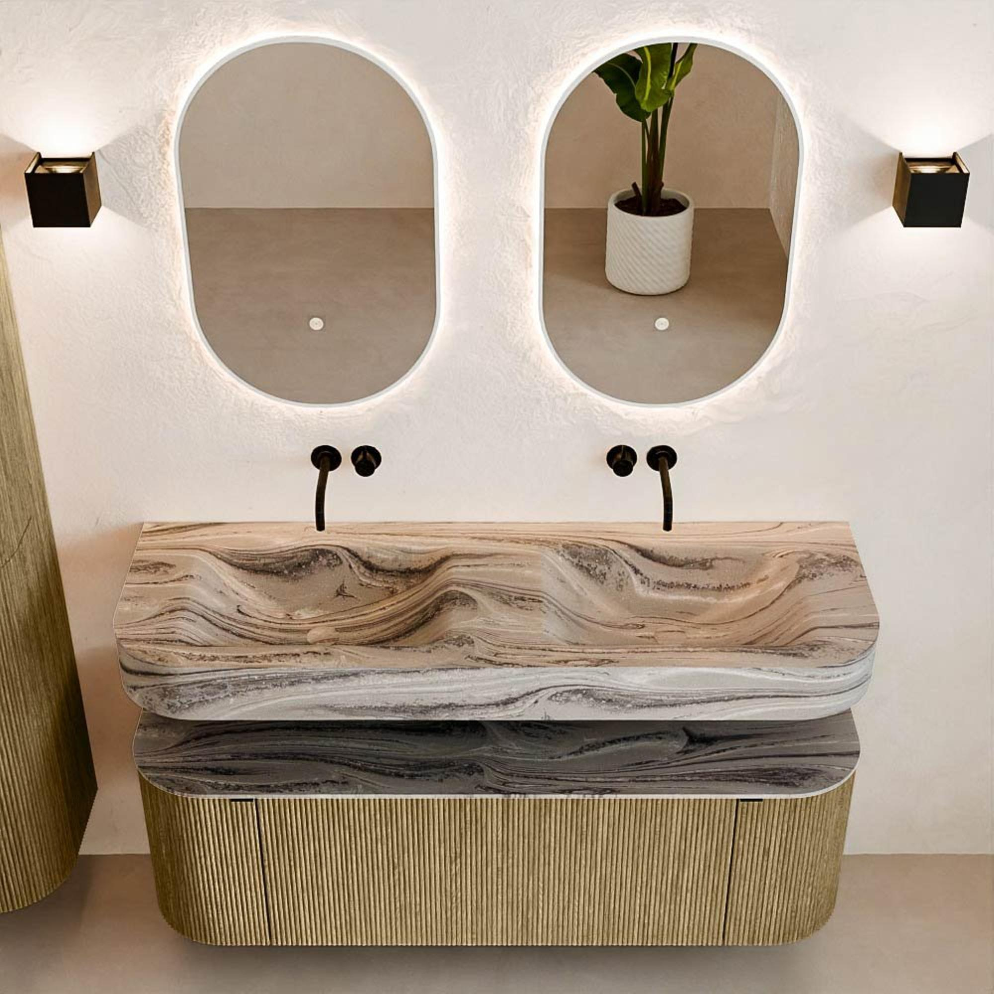 Matériaux naturels dans des tons chauds. Les nervures verticales apportent rythme et texture au design, tandis que le chêne confère une apparence chaleureuse et artisanale. Choisissez parmi 5 teintes de bois OAK, WALNUT, DUSK, SHADOW et RUBY, des couleurs de bois soigneusement sélectionnées pour enrichir les salles de bains modernes et classiques.