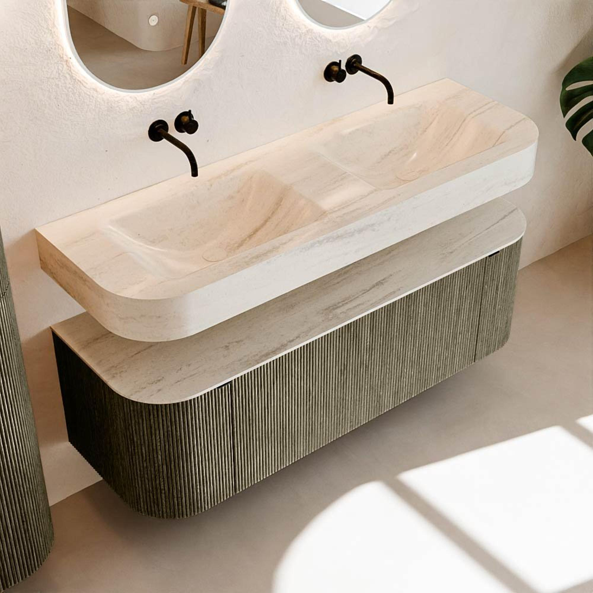 Au-dessus du meuble flotte une vasque suspendue assortie aux coins arrondis – parfaitement adaptée à la forme du meuble. La vasque est réalisée en Solid Surface et suit subtilement les lignes du meuble inférieur, créant ainsi un ensemble harmonieux. Le plan de travail en Solid Surface forme une base solide, facile d'entretien et complète la combinaison.