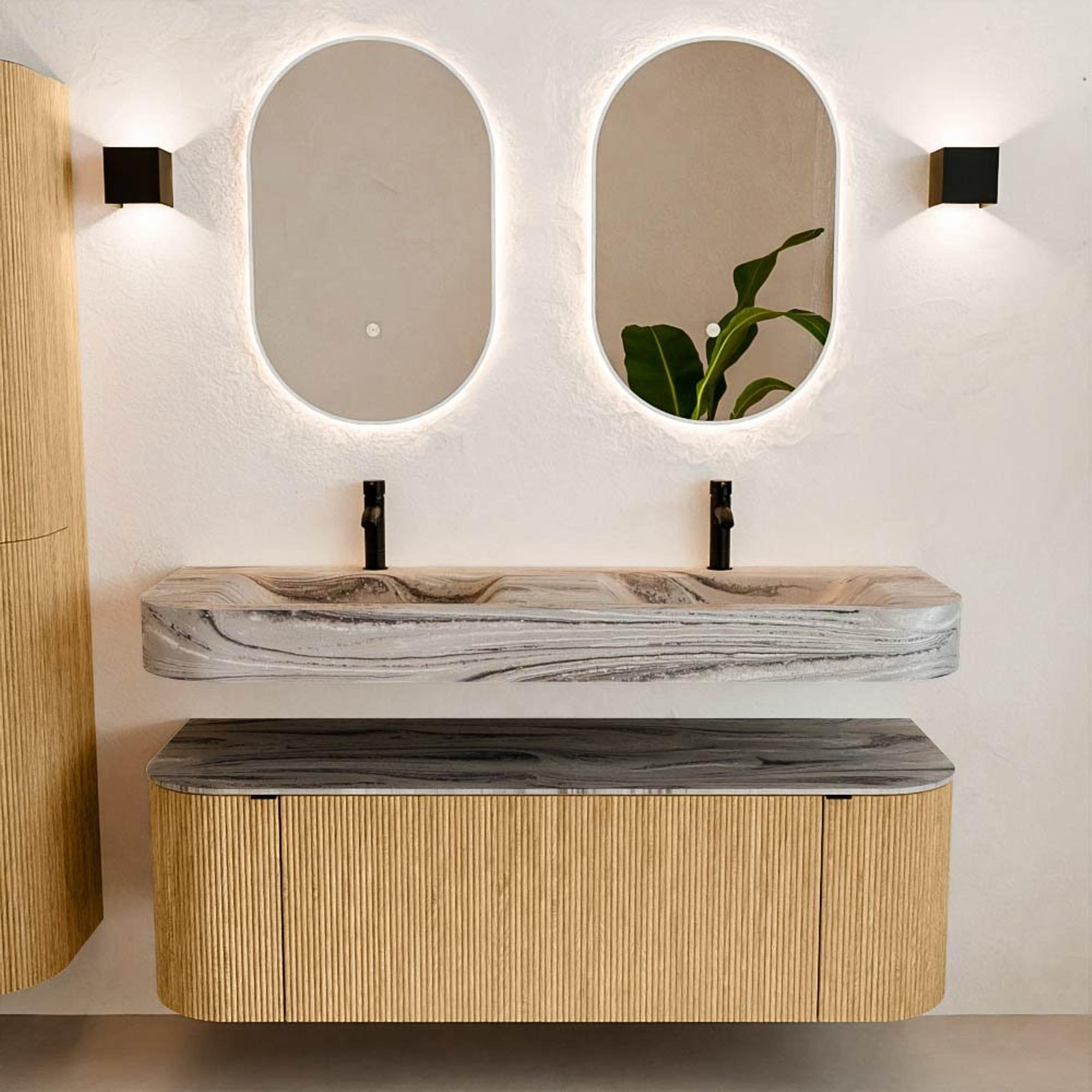 Matériaux naturels dans des tons chauds. Les nervures verticales apportent rythme et texture au design, tandis que le chêne confère une apparence chaleureuse et artisanale. Choisissez parmi 5 teintes de bois OAK, WALNUT, DUSK, SHADOW et RUBY, des couleurs de bois soigneusement sélectionnées pour enrichir les salles de bains modernes et classiques.