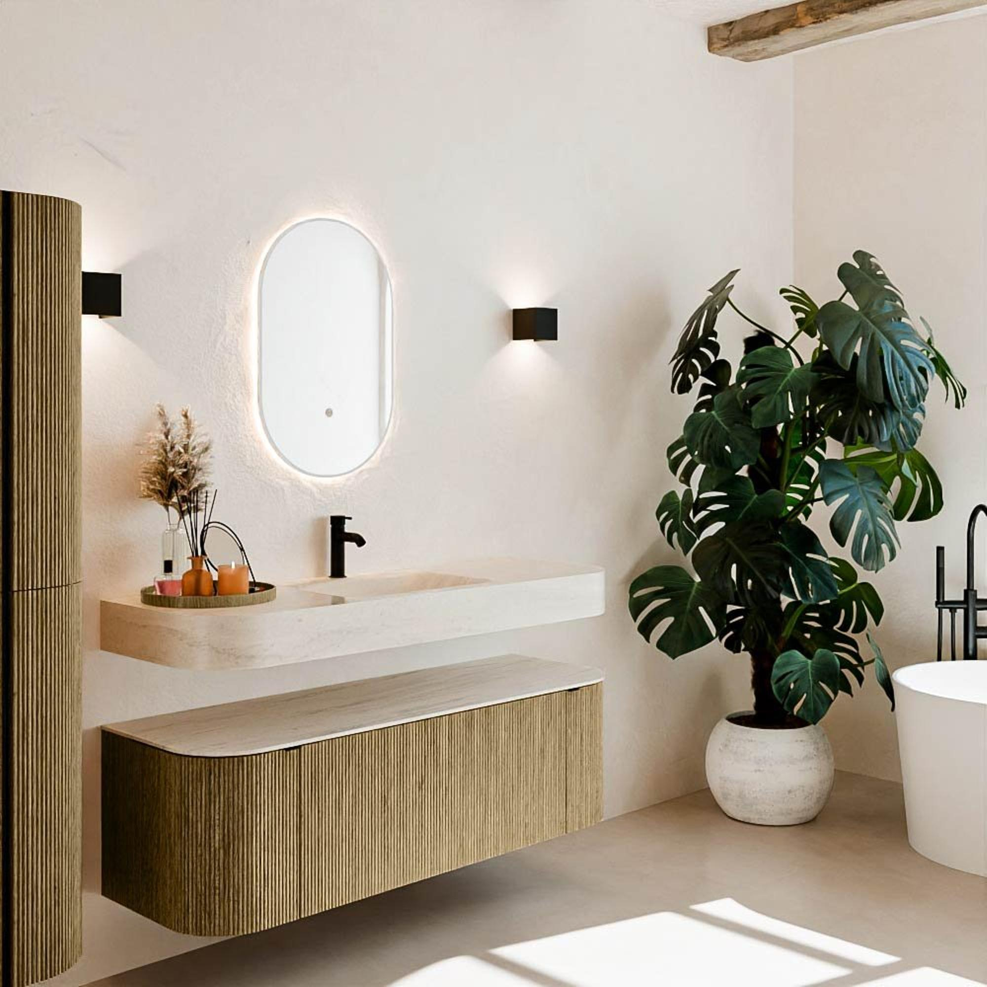 Matériaux naturels dans des tons chauds. Les nervures verticales apportent rythme et texture au design, tandis que le chêne confère une apparence chaleureuse et artisanale. Choisissez parmi 5 teintes de bois OAK, WALNUT, DUSK, SHADOW et RUBY, des couleurs de bois soigneusement sélectionnées pour enrichir les salles de bains modernes et classiques.