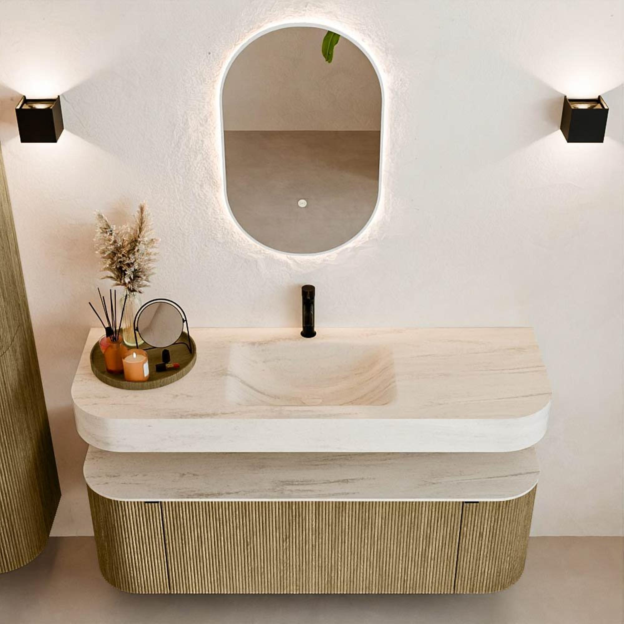 Au-dessus du meuble flotte une vasque suspendue assortie aux coins arrondis – parfaitement adaptée à la forme du meuble. La vasque est réalisée en Solid Surface et suit subtilement les lignes du meuble inférieur, créant ainsi un ensemble harmonieux. Le plan de travail en Solid Surface forme une base solide, facile d'entretien, et complète la combinaison.