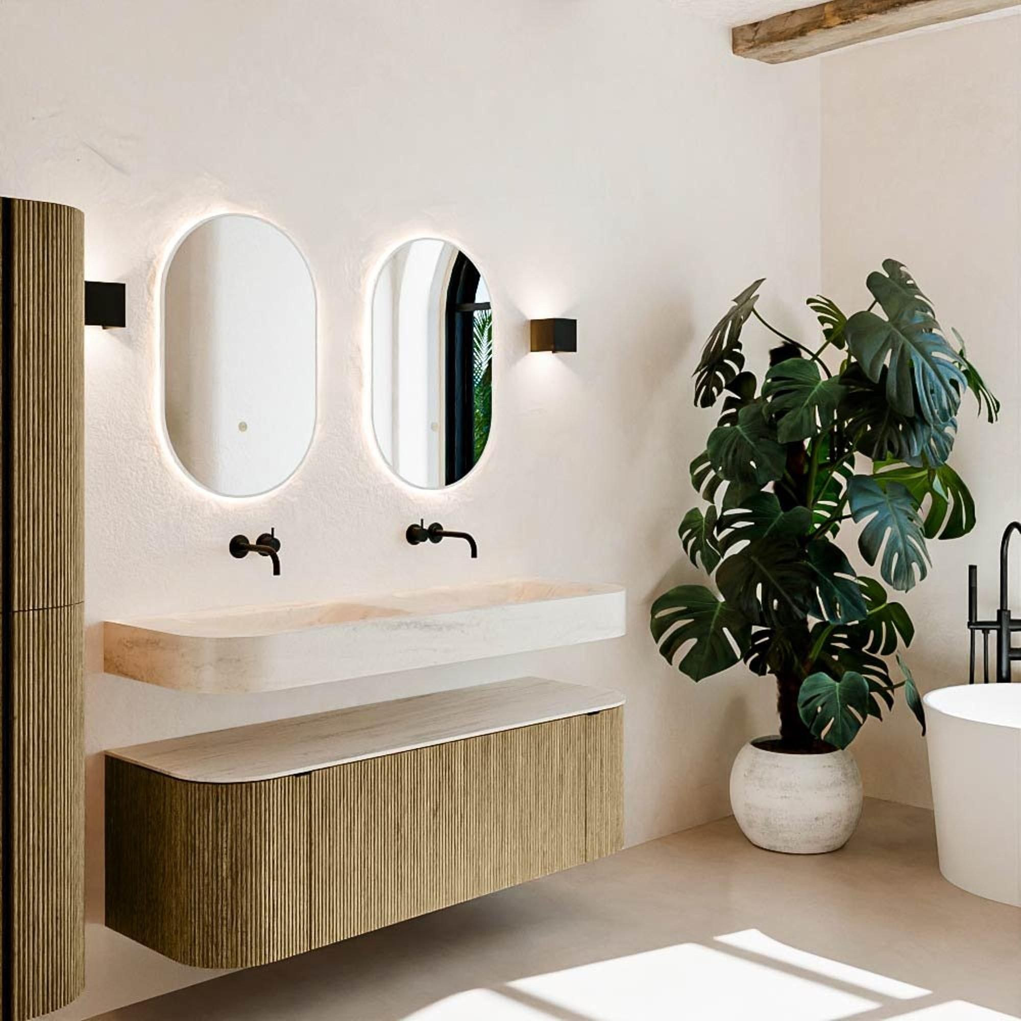 Matériaux naturels dans des tons chauds. Les nervures verticales apportent rythme et texture au design, tandis que le chêne confère une apparence chaleureuse et artisanale. Choisissez parmi 5 teintes de bois OAK, WALNUT, DUSK, SHADOW et RUBY, des couleurs de bois soigneusement sélectionnées pour enrichir les salles de bains modernes et classiques.