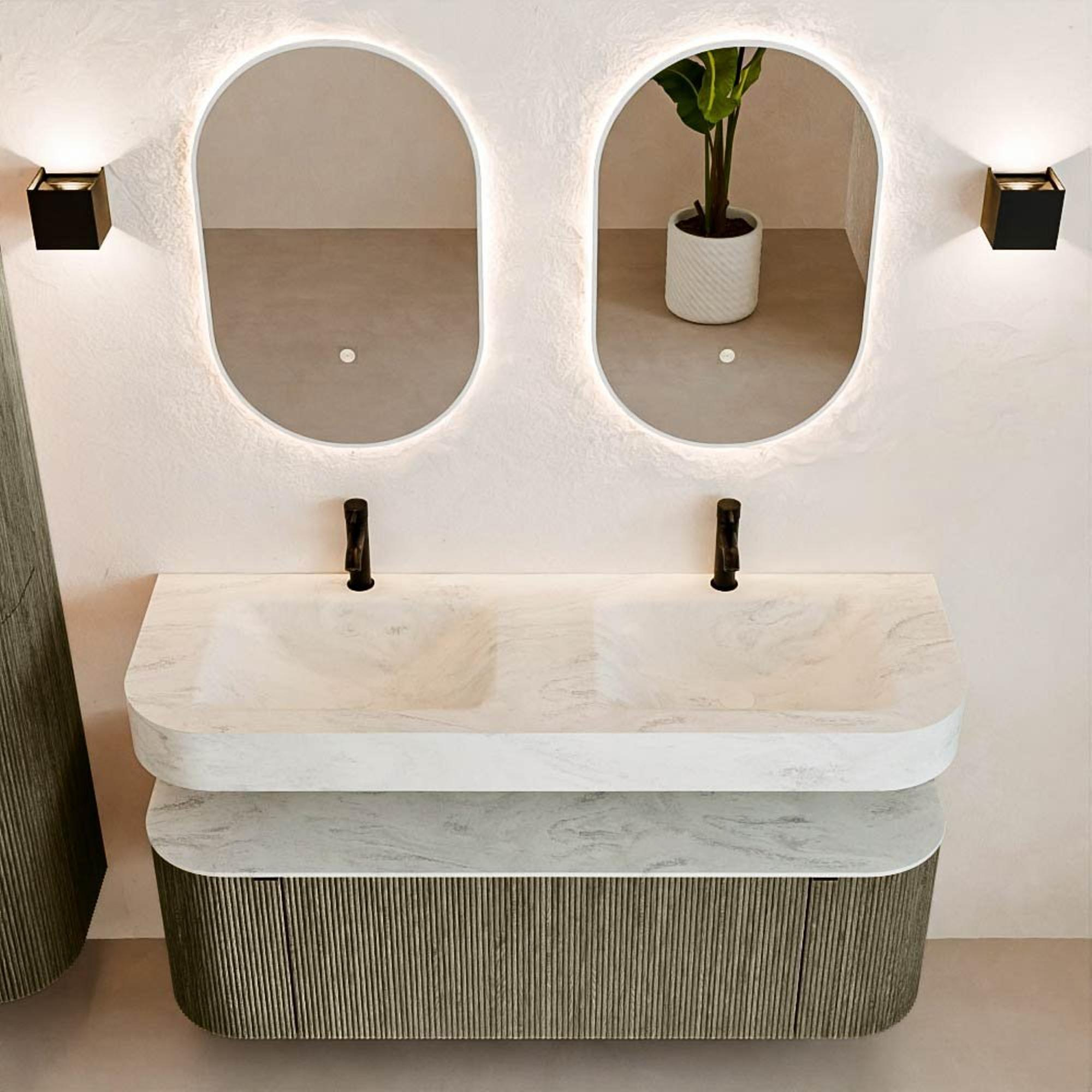 Matériaux naturels dans des tons chauds. Les nervures verticales apportent rythme et texture au design, tandis que le chêne confère une apparence chaleureuse et artisanale. Choisissez parmi 5 teintes de bois OAK, WALNUT, DUSK, SHADOW et RUBY, des couleurs de bois soigneusement sélectionnées pour enrichir les salles de bains modernes et classiques.