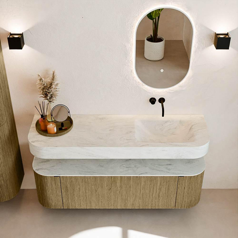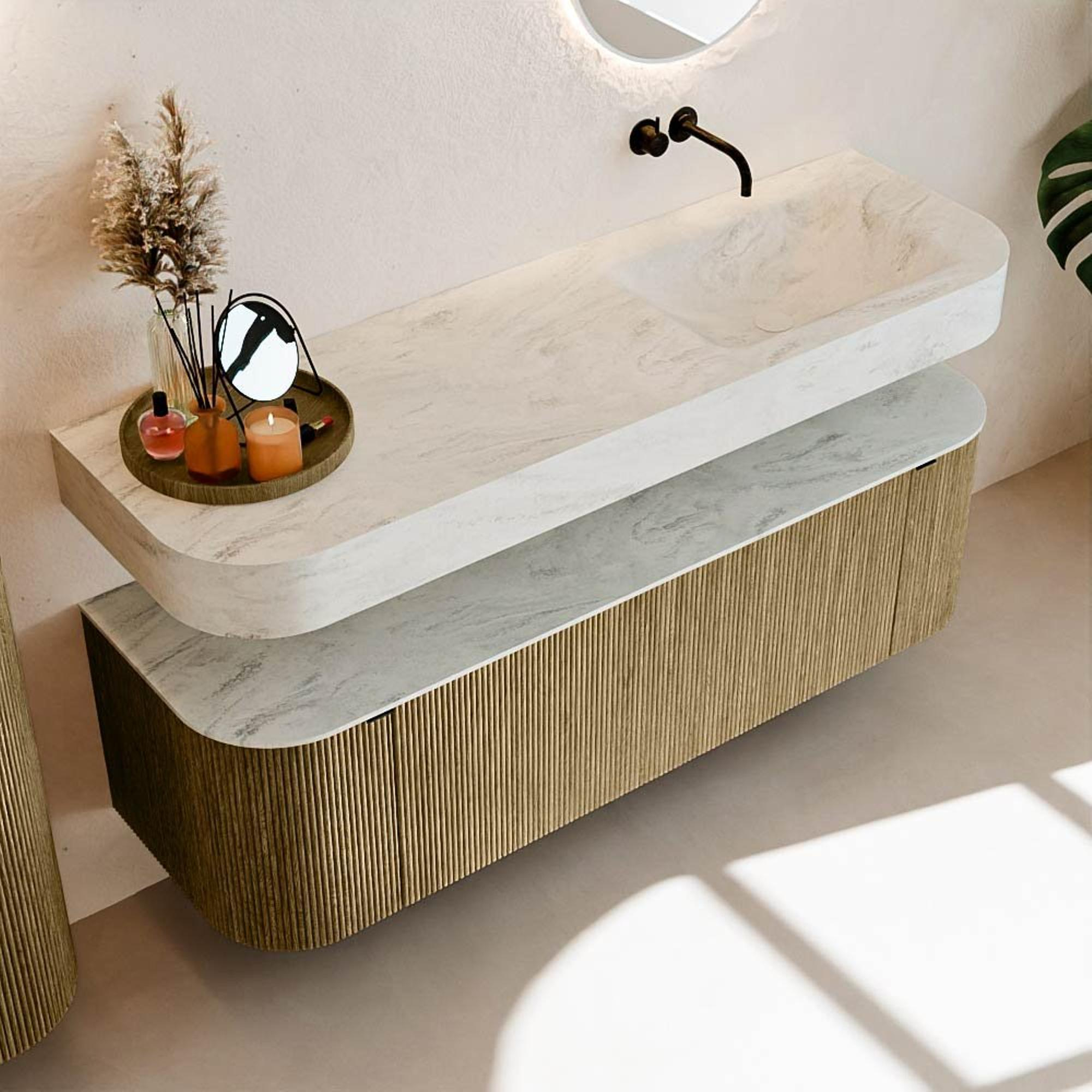 Matériaux naturels dans des tons chauds. Les cannelures verticales apportent rythme et texture au design, tandis que le chêne confère une apparence chaleureuse et artisanale. Choisissez parmi 5 teintes de bois OAK, WALNUT, DUSK, SHADOW et RUBY, des couleurs de bois soigneusement sélectionnées pour enrichir les salles de bains modernes et classiques.