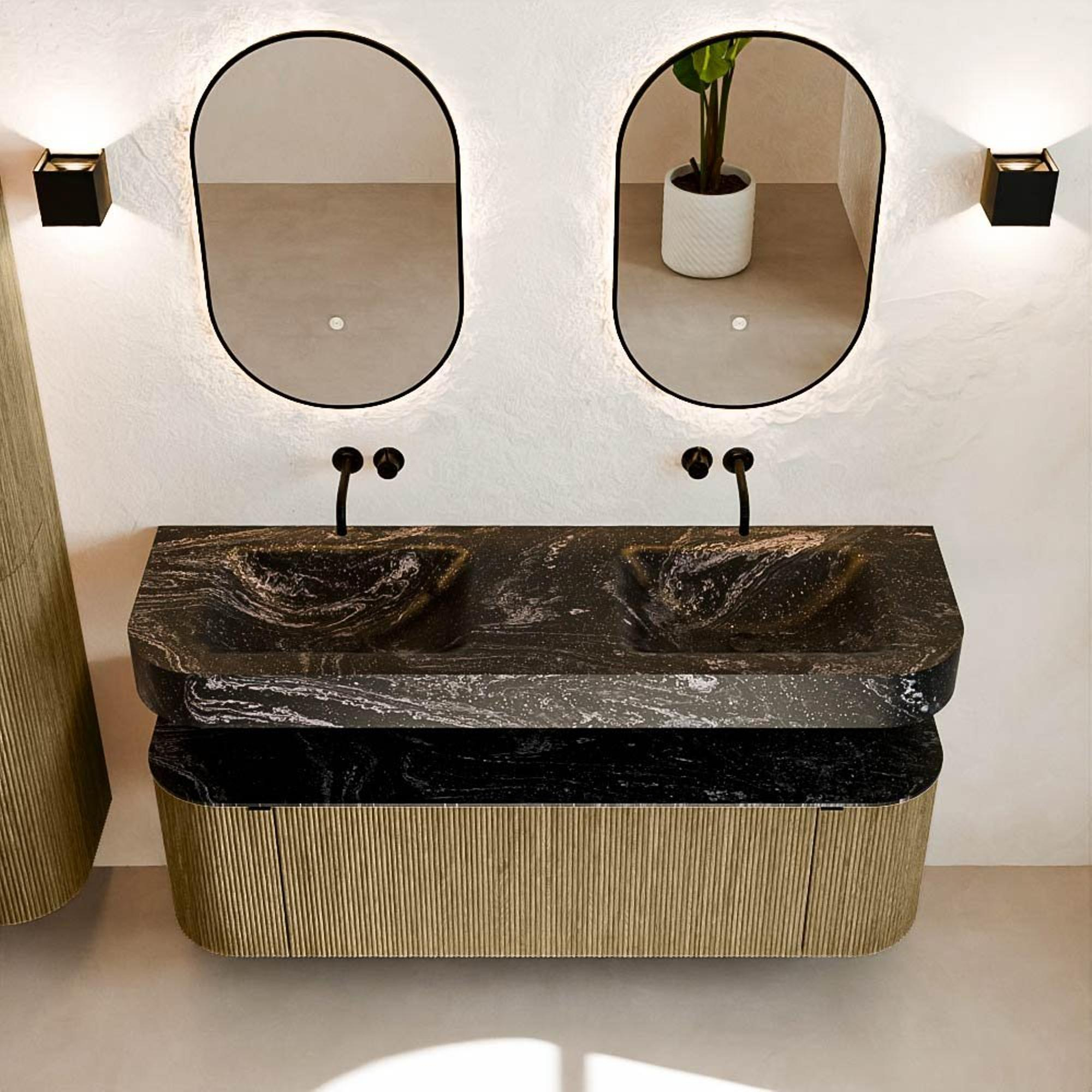 Matériaux naturels dans des tons chauds. Les nervures verticales apportent rythme et texture au design, tandis que le chêne confère une apparence chaleureuse et artisanale. Choisissez parmi 5 teintes de bois OAK, WALNUT, DUSK, SHADOW et RUBY, des couleurs de bois soigneusement sélectionnées pour enrichir les salles de bains modernes et classiques.