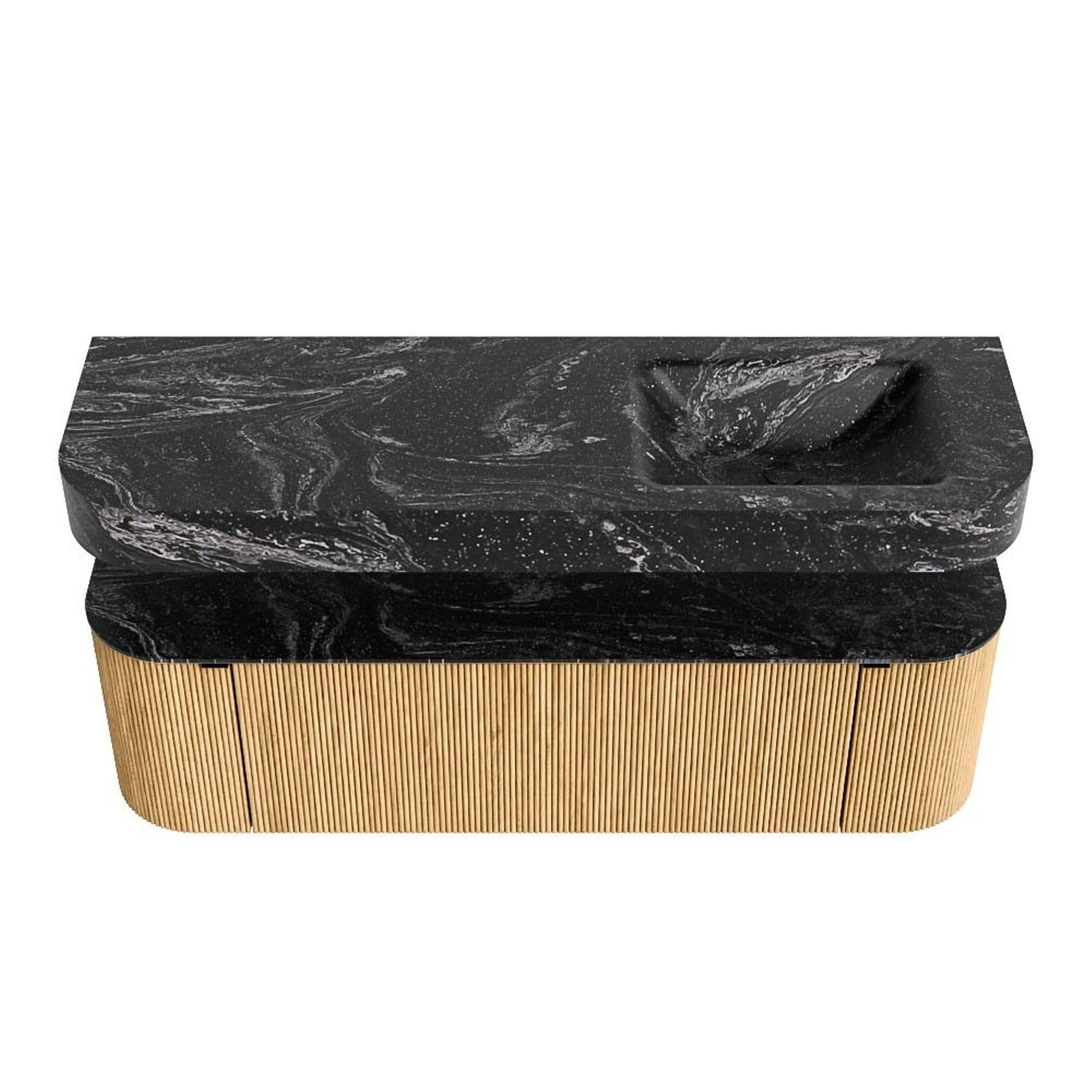 MONDIAZ THOR-DLUX 150cm meuble de salle de bains arrondi gauche + droite couleur Oak avec 1 tiroir et 2 portes. Vasque suspendue CLOUD droite sans trou de robinet couleur Lava.