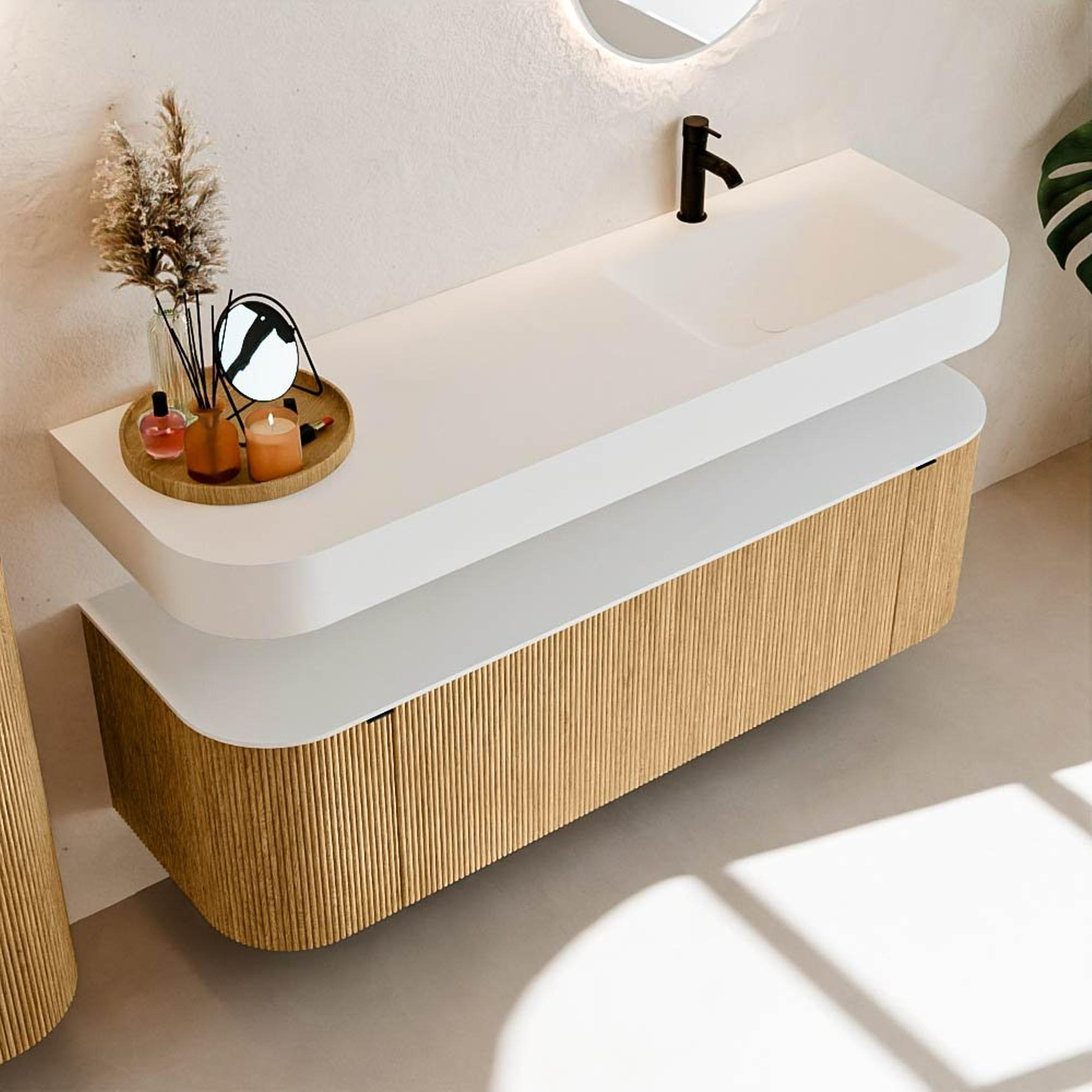 Au-dessus du meuble flotte une vasque suspendue assortie aux coins arrondis – parfaitement adaptée à la forme du meuble. La vasque est réalisée en Solid Surface et suit subtilement les lignes du meuble inférieur, créant un ensemble harmonieux. Le plan de travail en Solid Surface constitue une base solide, facile d'entretien, et complète la combinaison.