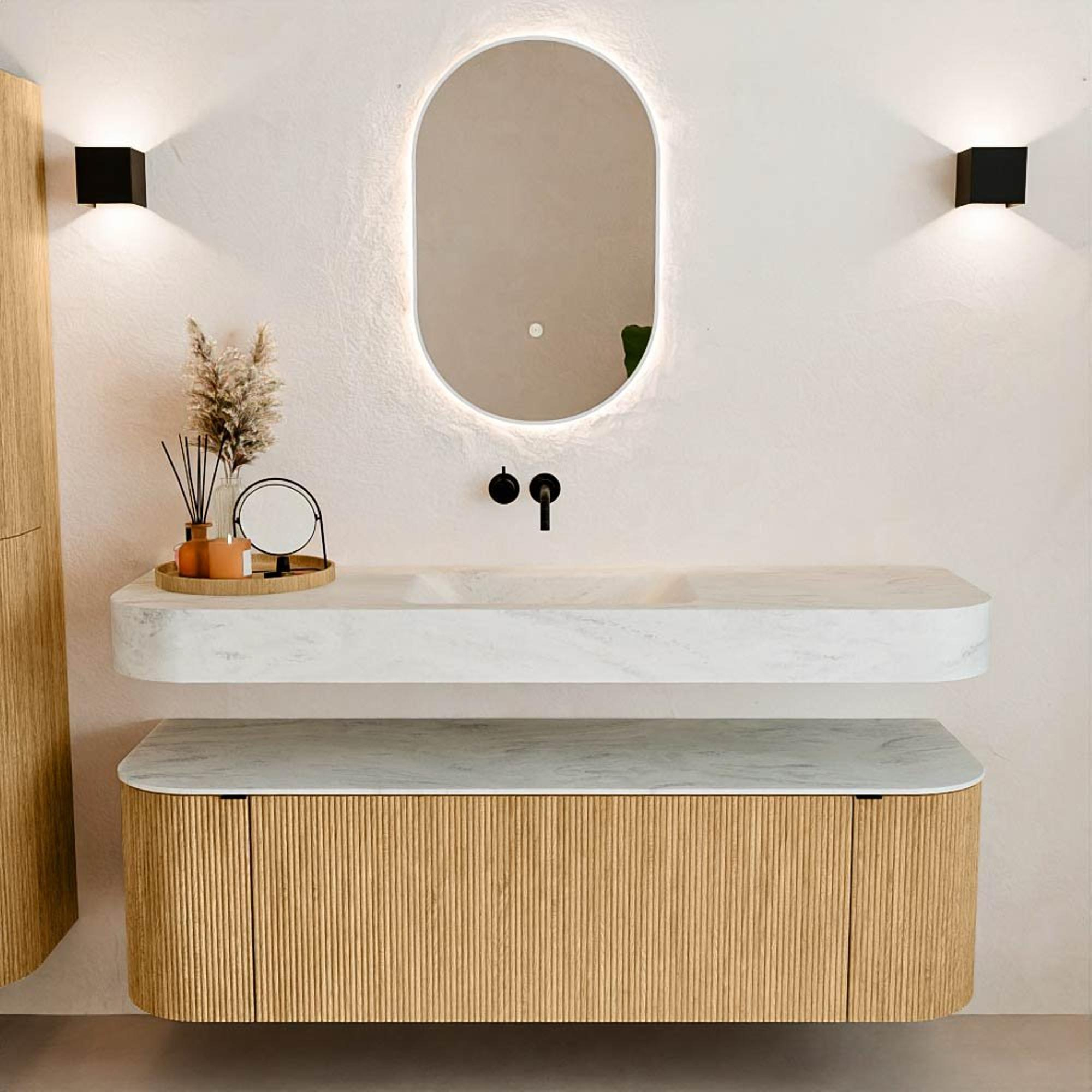 Matériaux naturels aux teintes chaudes. Les nervures verticales apportent rythme et texture au design, tandis que le chêne confère une apparence chaleureuse et artisanale. Choisissez parmi 5 teintes de bois CHÊNE, NOYER, DUSK, SHADOW et RUBY, des couleurs de bois soigneusement sélectionnées pour enrichir les salles de bains modernes et classiques.