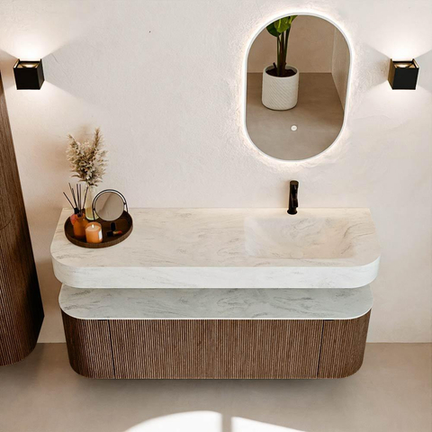 MONDIAZ THOR-DLUX 150cm meuble de salle de bains arrondi gauche + droite couleur Walnut avec 1 tiroir et 2 portes. Vasque suspendue CLOUD Droite 1 trou de robinet couleur Opalo.