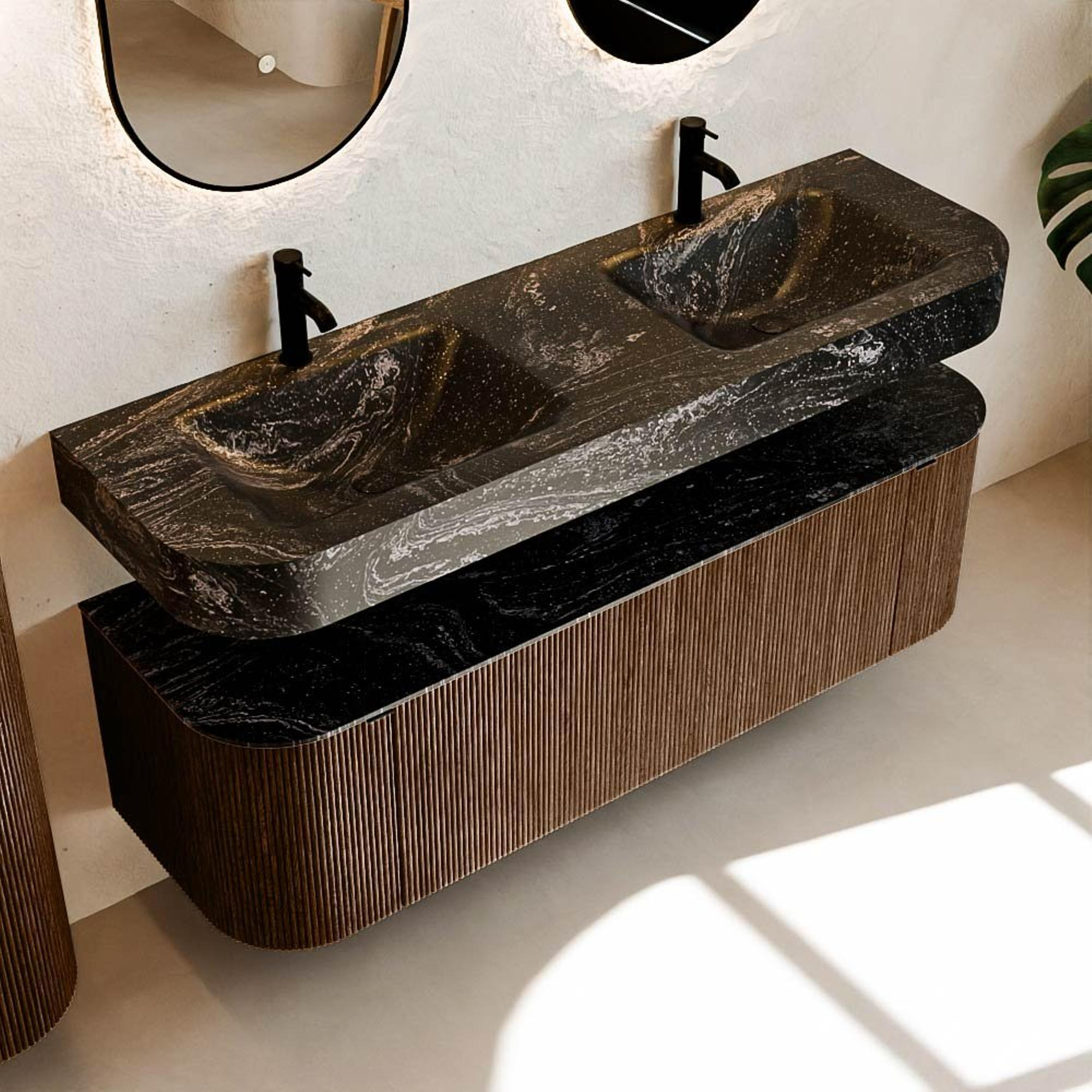 MONDIAZ THOR-DLUX 150cm meuble de salle de bains arrondi gauche + droite couleur Walnut avec 1 tiroir et 2 portes. Vasque suspendue CLOUD Double 2 trous de robinet couleur Lava.