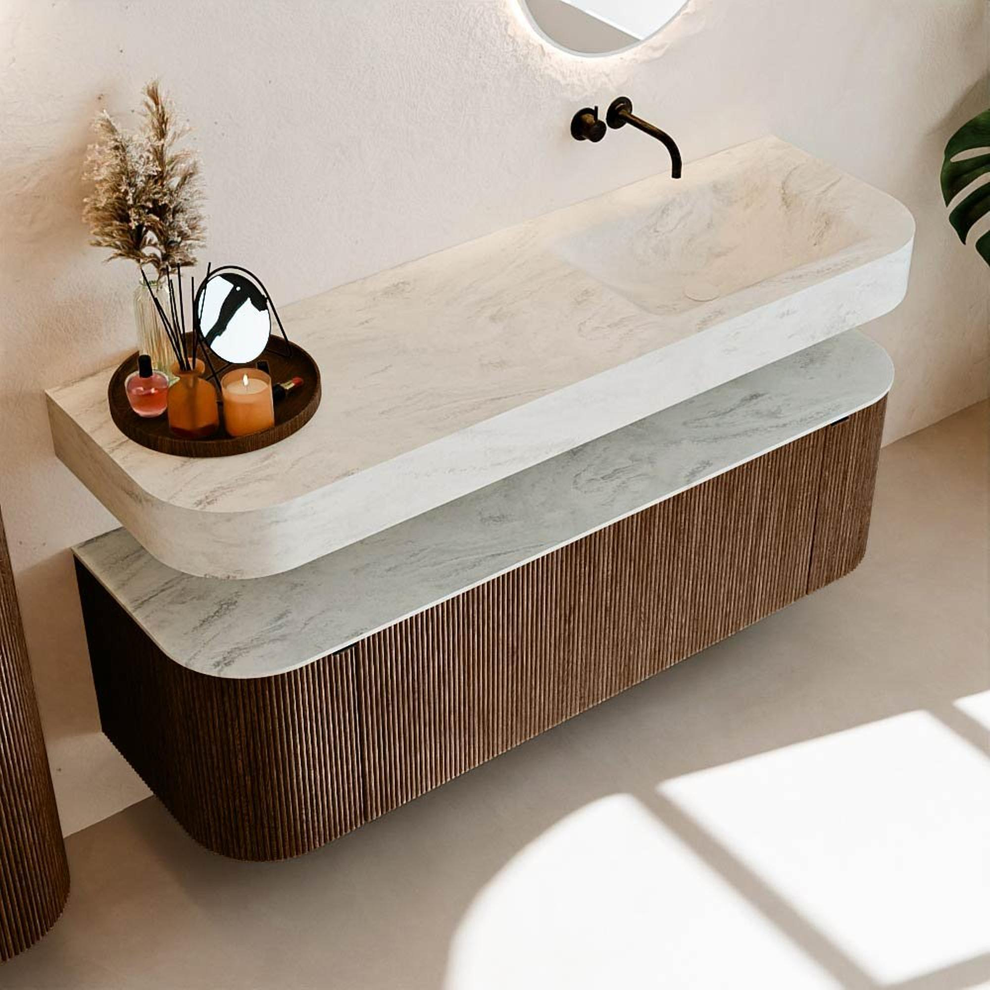 Au-dessus du meuble flotte une vasque suspendue assortie aux coins arrondis – parfaitement adaptée à la forme du meuble. La vasque est réalisée en Solid Surface et suit subtilement les lignes du meuble inférieur, créant un ensemble harmonieux. Le plan de travail en Solid Surface forme une base solide et facile d'entretien et complète la combinaison.