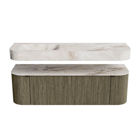 MONDIAZ THOR-DLUX 150cm meuble de salle de bains arrondi gauche + droite couleur Shadow avec 1 tiroir et 2 portes. Vasque suspendue CLOUD Gauche 1 trou de robinet couleur Frappe.