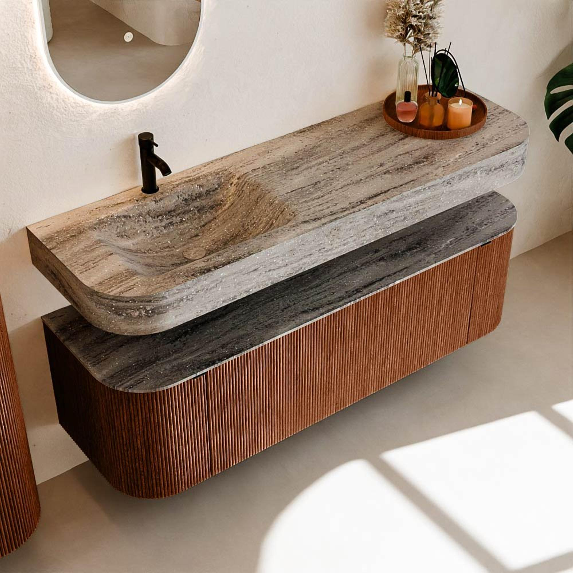 Matériaux naturels dans des tons chauds. Les nervures verticales apportent rythme et texture au design, tandis que le chêne confère une apparence chaleureuse et artisanale. Choisissez parmi 5 teintes de bois OAK, WALNUT, DUSK, SHADOW et RUBY, des couleurs de bois soigneusement sélectionnées pour enrichir les salles de bains modernes et classiques.