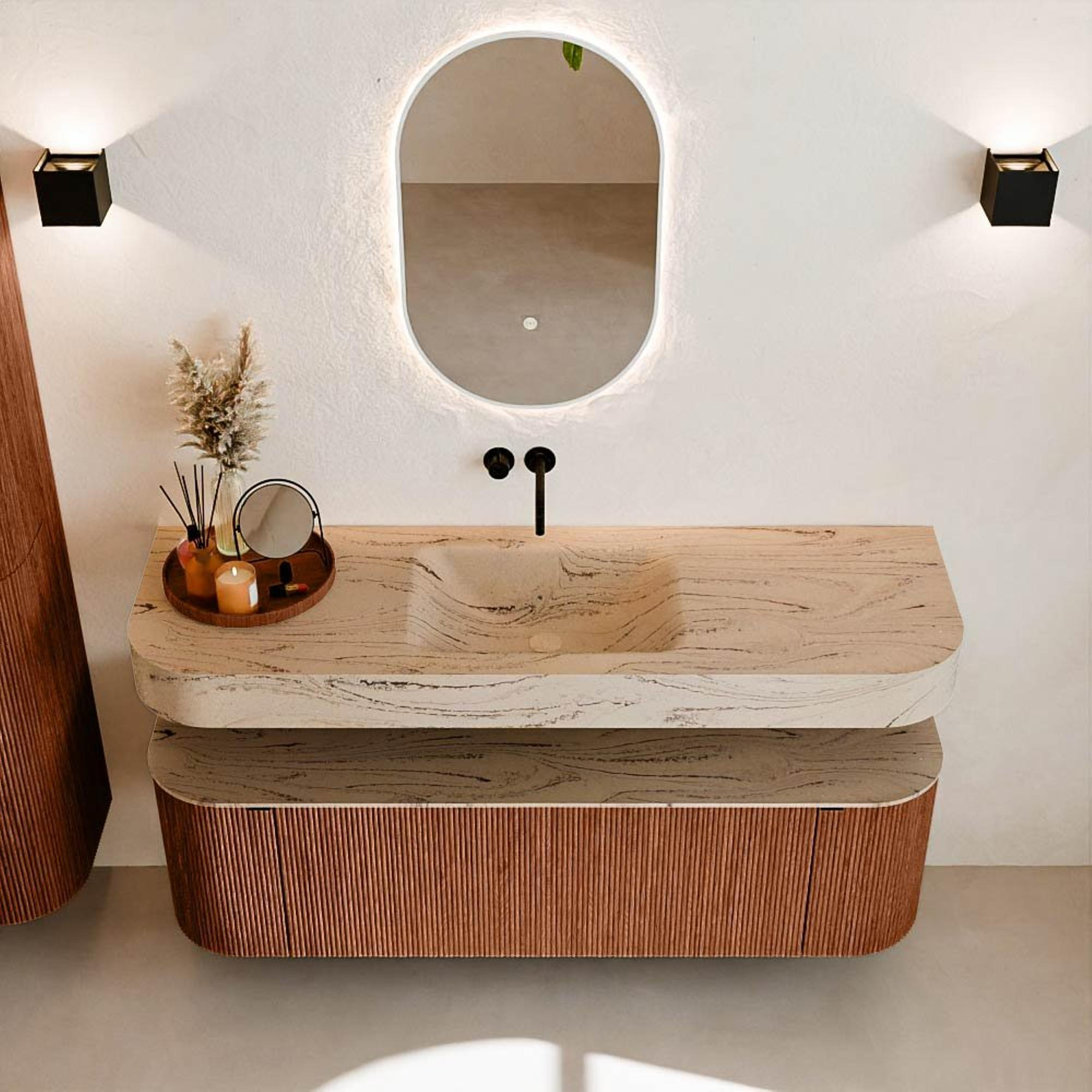 Matériaux naturels dans des tons chauds. Les cannelures verticales apportent rythme et texture au design, tandis que le chêne confère une apparence chaleureuse et artisanale. Choisissez parmi 5 teintes de bois OAK, WALNUT, DUSK, SHADOW et RUBY, des couleurs de bois soigneusement sélectionnées pour enrichir les salles de bains modernes et classiques.