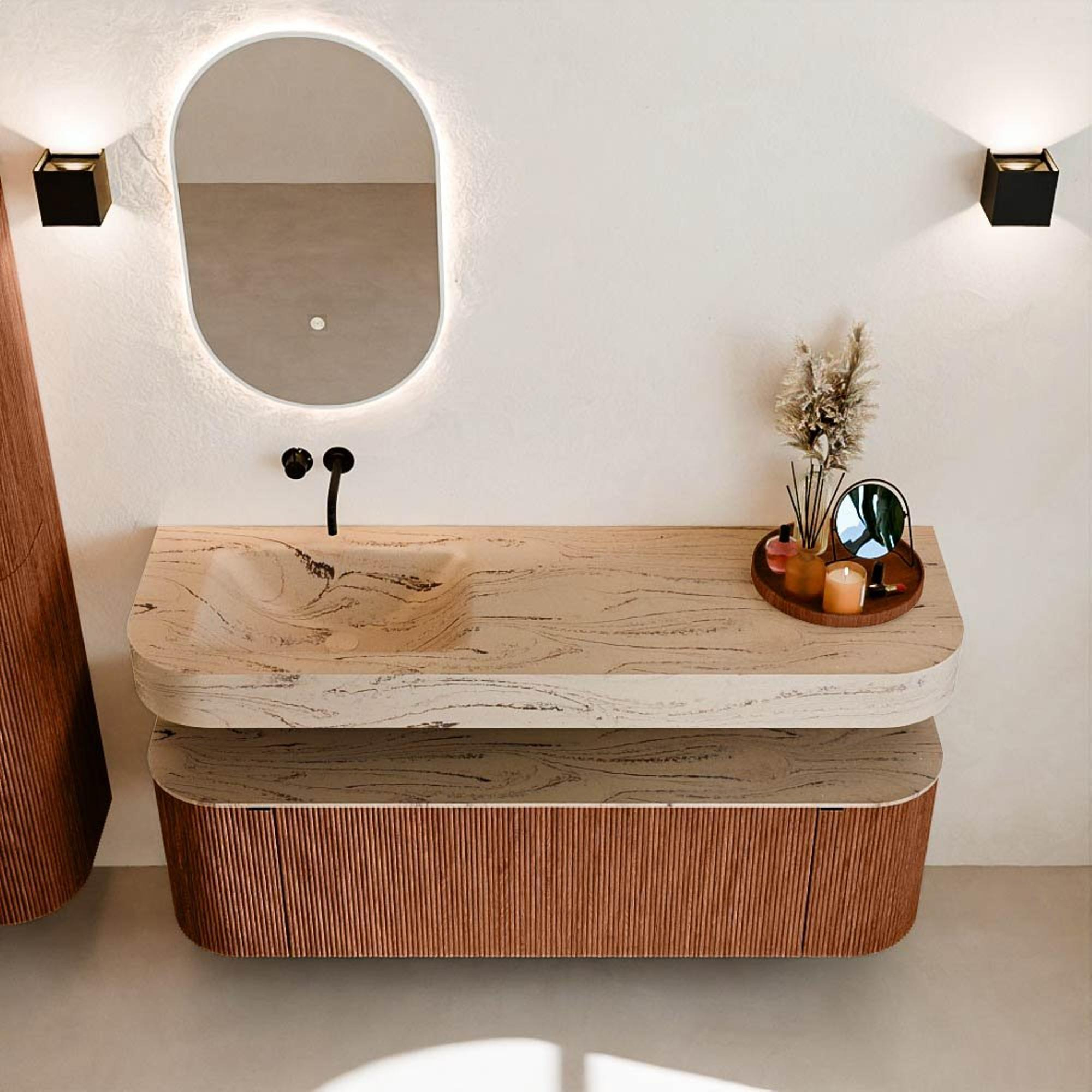 Matériaux naturels aux teintes chaudes. Les nervures verticales apportent rythme et texture au design, tandis que le chêne confère une apparence chaleureuse et artisanale. Choisissez parmi 5 teintes de bois OAK, WALNUT, DUSK, SHADOW et RUBY, des couleurs de bois soigneusement sélectionnées pour enrichir les salles de bains modernes et classiques.
