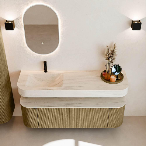 Au-dessus du meuble flotte une vasque suspendue assortie aux coins arrondis – parfaitement adaptée à la forme du meuble. La vasque est en Solid Surface et suit subtilement les lignes du meuble inférieur, créant ainsi un ensemble harmonieux. Le plan de travail en Solid Surface forme une base solide et facile d'entretien, complétant la combinaison.