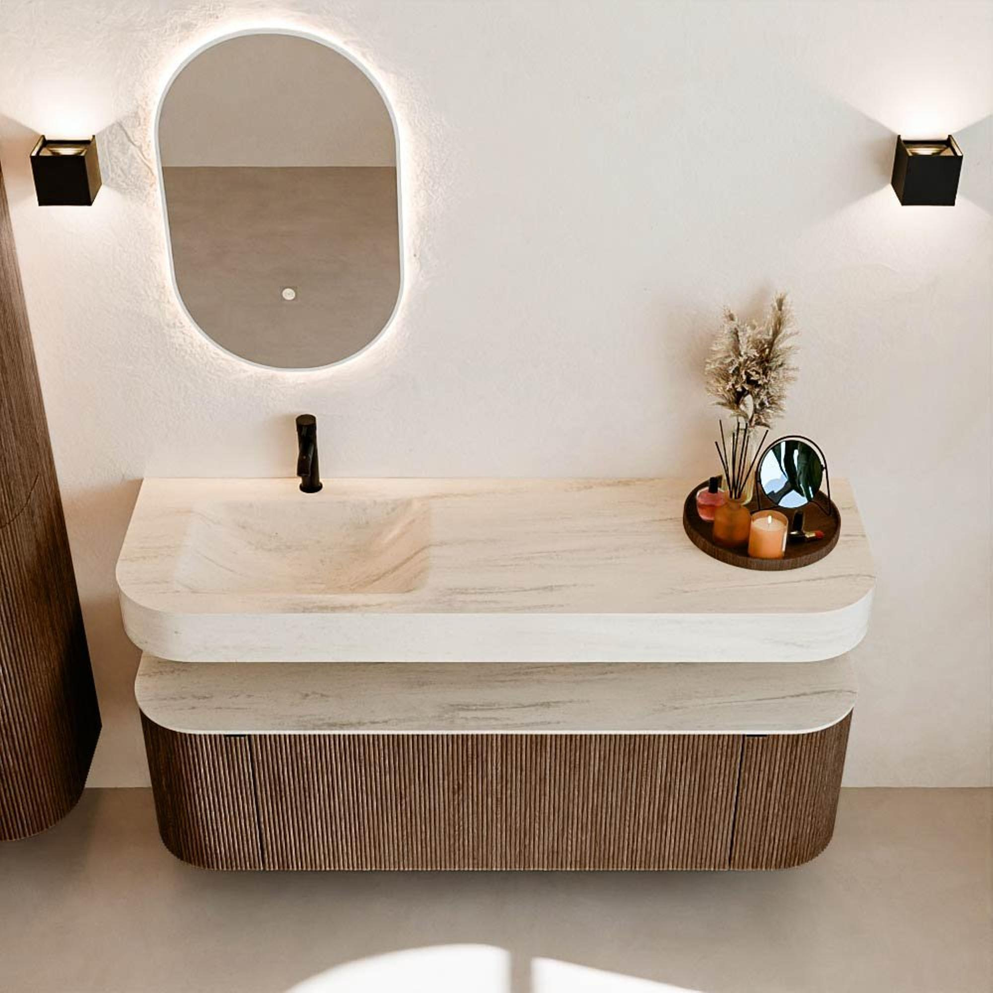 Au-dessus du meuble flotte une vasque suspendue assortie aux coins arrondis – parfaitement adaptée à la forme du meuble. La vasque est réalisée en Solid Surface et suit subtilement les lignes du meuble inférieur, créant ainsi un ensemble harmonieux. Le plan de travail en Solid Surface constitue une base solide et facile d'entretien et complète la combinaison.
