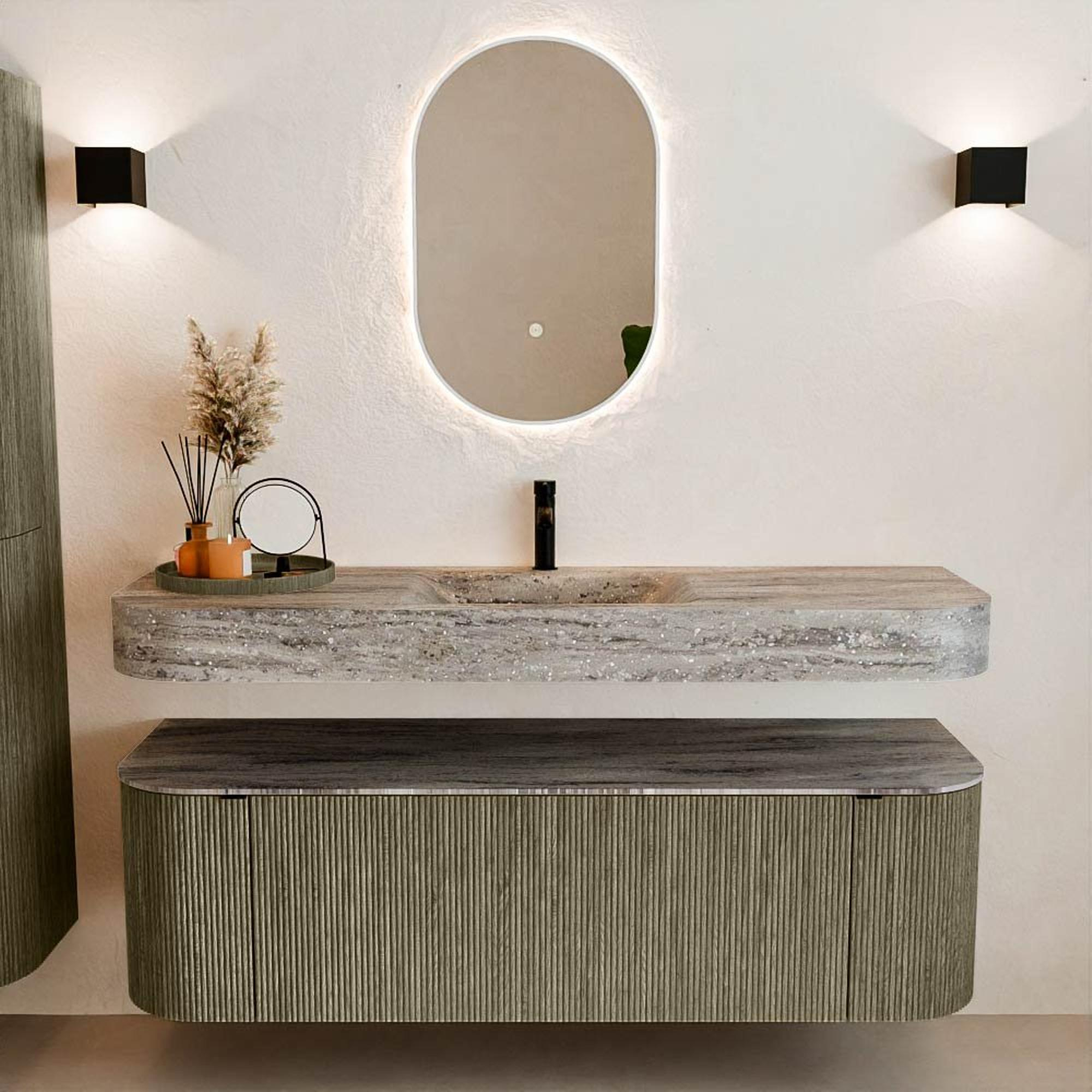 Matériaux naturels dans des tons chauds. Les cannelures verticales apportent rythme et texture au design, tandis que le chêne confère une apparence chaleureuse et artisanale. Choisissez parmi 5 teintes de bois OAK, WALNUT, DUSK, SHADOW et RUBY, des couleurs de bois soigneusement sélectionnées pour enrichir les salles de bains modernes et classiques.