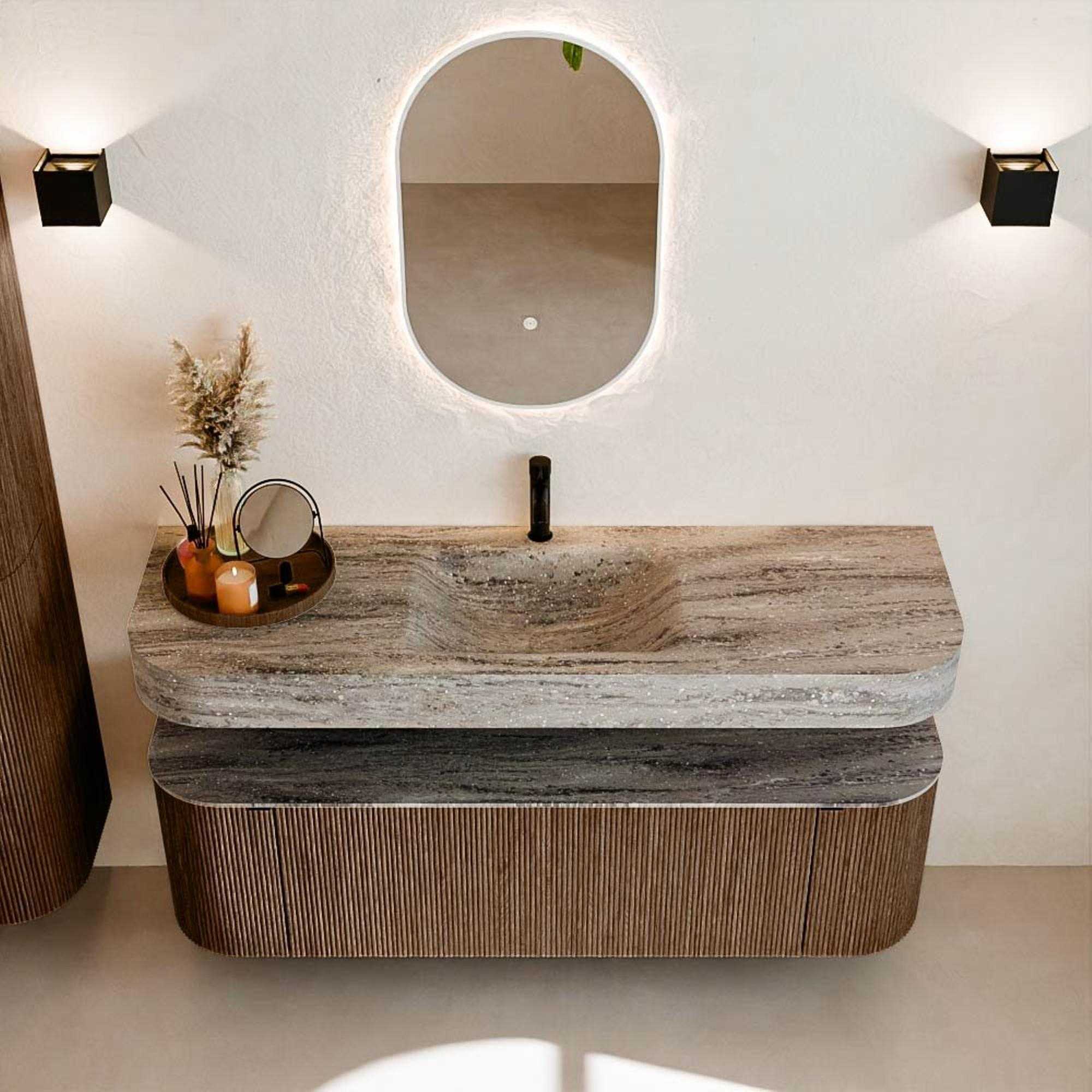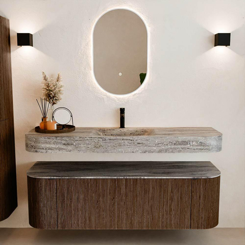 Matériaux naturels dans des teintes chaudes. Les rainures verticales apportent rythme et texture au design, tandis que le chêne confère une apparence chaleureuse et artisanale. Choisissez parmi 5 teintes de bois OAK, WALNUT, DUSK, SHADOW et RUBY, des couleurs de bois soigneusement sélectionnées pour enrichir les salles de bains modernes et classiques.
