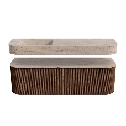 MONDIAZ THOR-DLUX 150cm meuble de salle de bains arrondi gauche + droite couleur Walnut avec 1 tiroir et 2 portes. Vasque suspendue CLOUD Gauche 1 trou de robinet couleur Saba.
