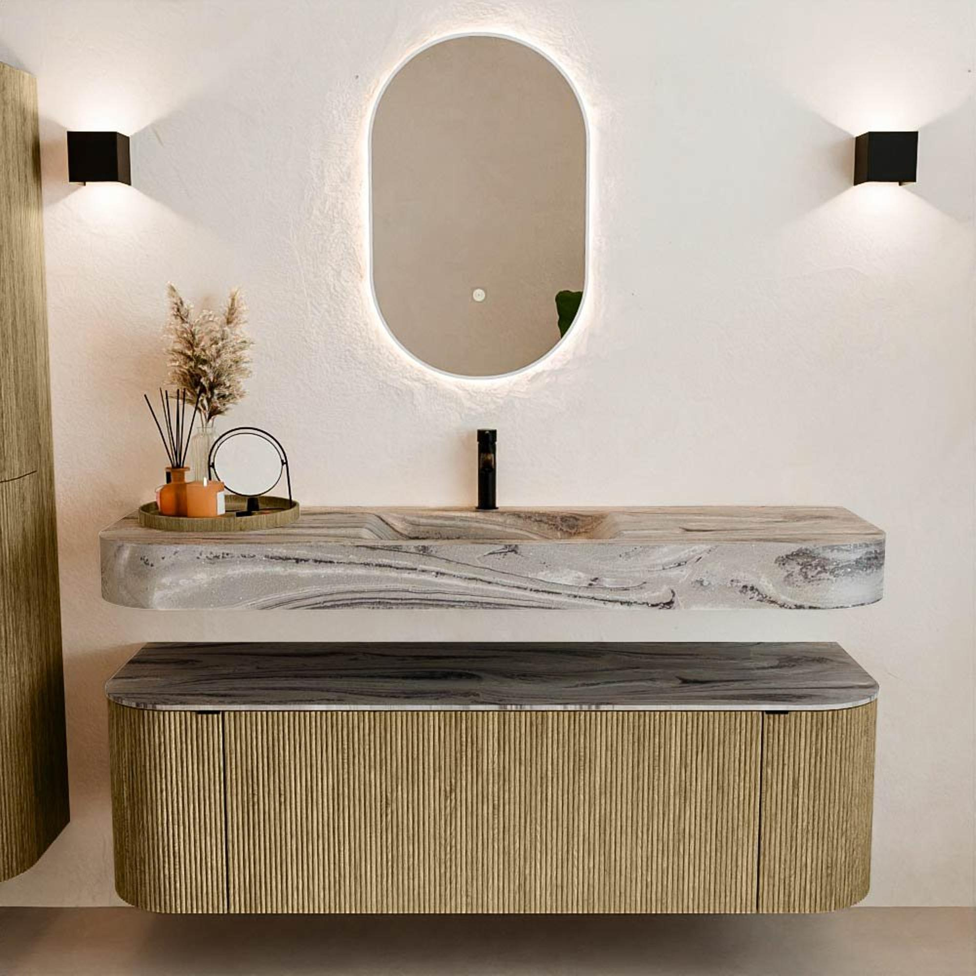 Matériaux naturels dans des tons chauds. Les nervures verticales apportent rythme et texture au design, tandis que le chêne confère une apparence chaleureuse et artisanale. Choisissez parmi 5 teintes de bois OAK, WALNUT, DUSK, SHADOW et RUBY, des couleurs de bois soigneusement sélectionnées pour enrichir les salles de bains modernes et classiques.