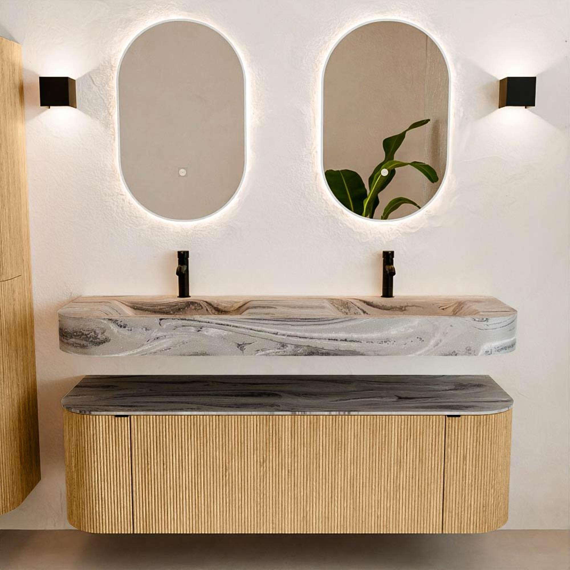 Matériaux naturels dans des tons chauds. Les cannelures verticales apportent rythme et texture au design, tandis que le chêne confère une apparence chaleureuse et artisanale. Choisissez parmi 5 teintes de bois Chêne, Noyer, Dusk, Shadow et Ruby, des couleurs de bois soigneusement sélectionnées pour enrichir les salles de bains modernes et classiques.