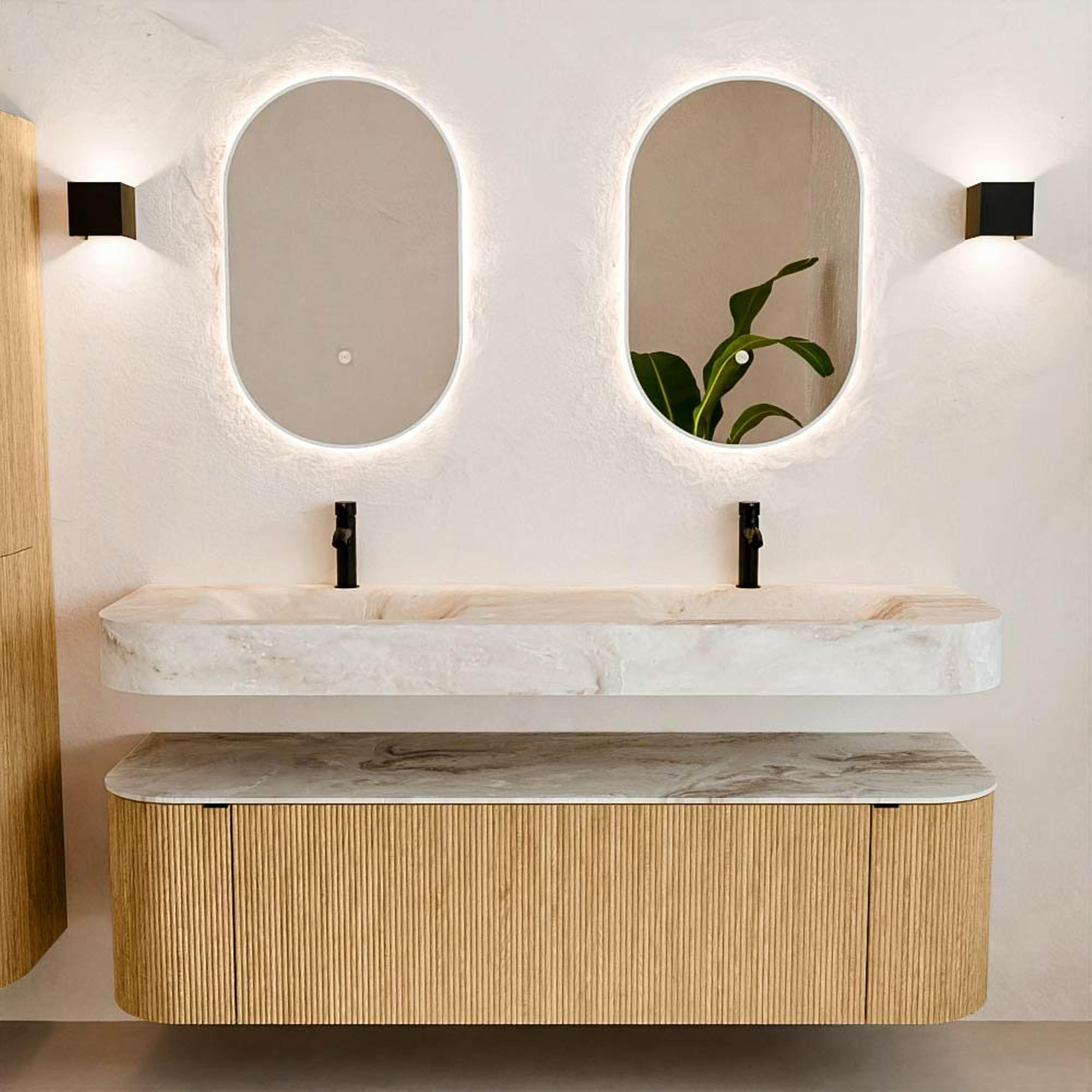 Matériaux naturels dans des tons chauds. Les nervures verticales apportent rythme et texture au design, tandis que le chêne confère une apparence chaleureuse et artisanale. Choisissez parmi 5 teintes de bois OAK, WALNUT, DUSK, SHADOW et RUBY, des couleurs de bois soigneusement sélectionnées pour enrichir les salles de bains modernes et classiques.