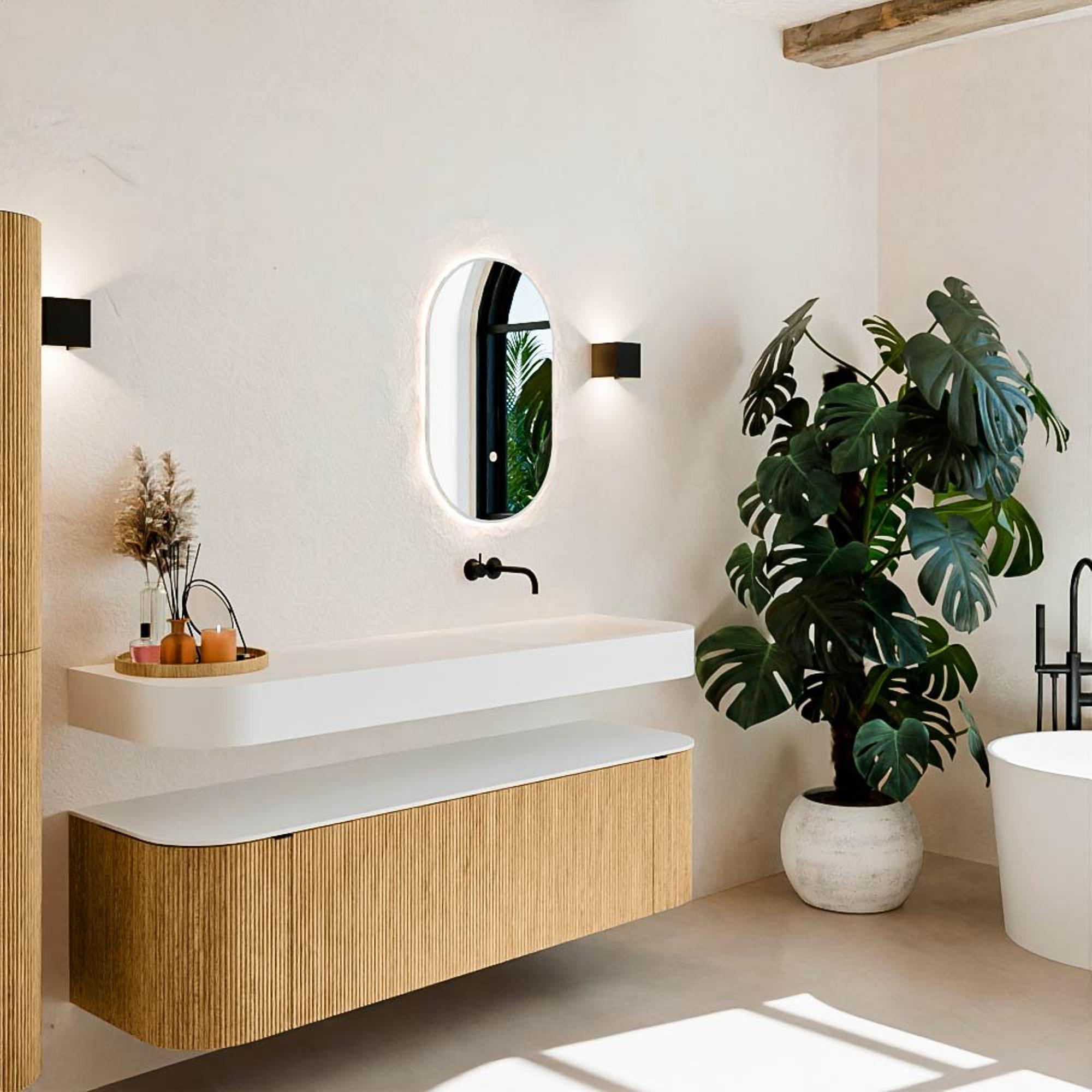 Matériaux naturels dans des tons chauds. Les rainures verticales apportent rythme et texture au design, tandis que le chêne confère une apparence chaleureuse et artisanale. Choisissez parmi 5 teintes de bois OAK, WALNUT, DUSK, SHADOW et RUBY, des couleurs de bois soigneusement sélectionnées pour enrichir les salles de bains modernes et classiques.