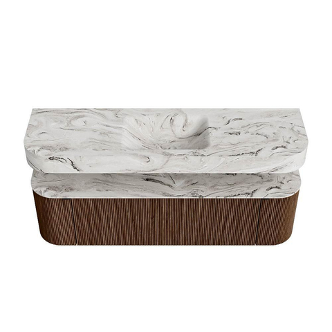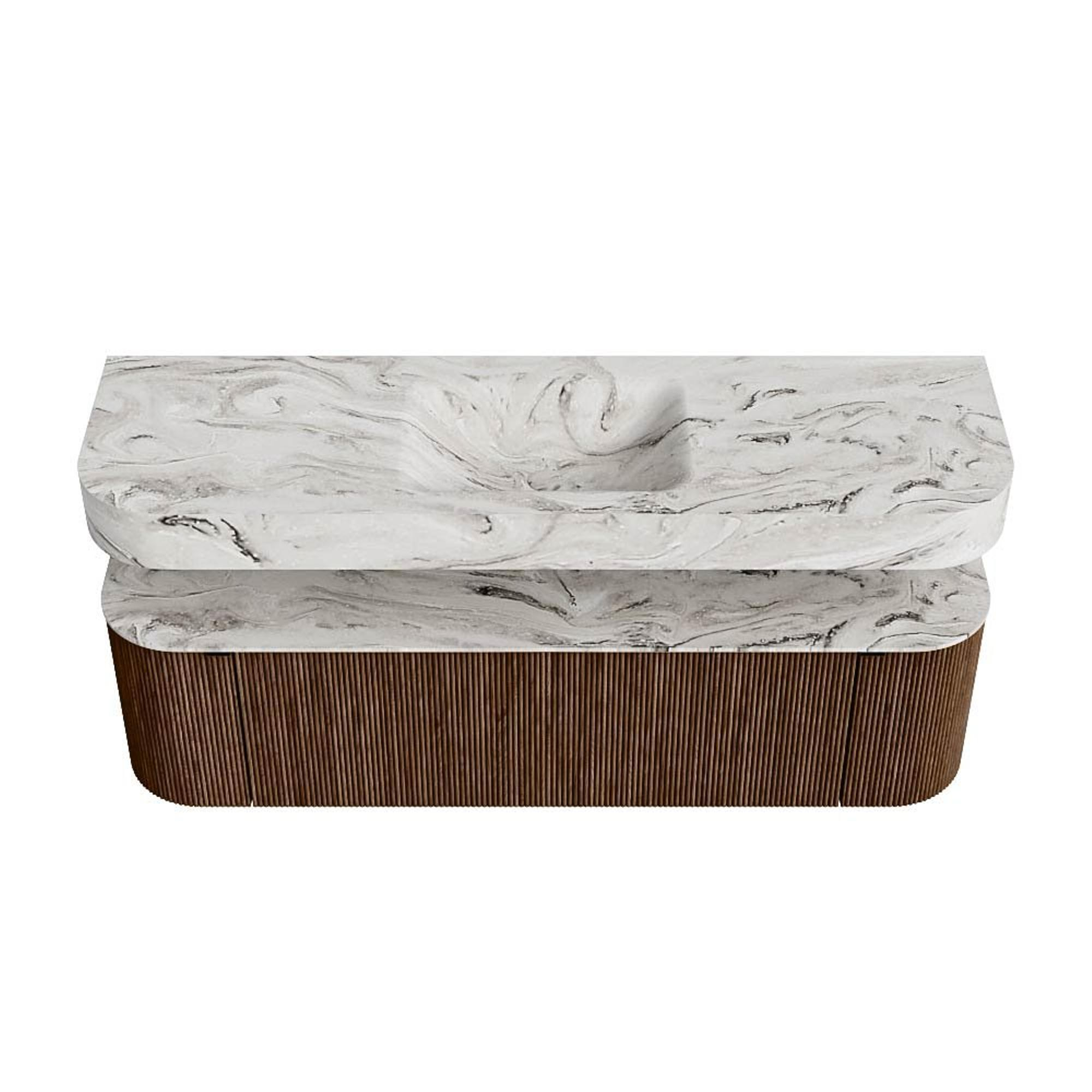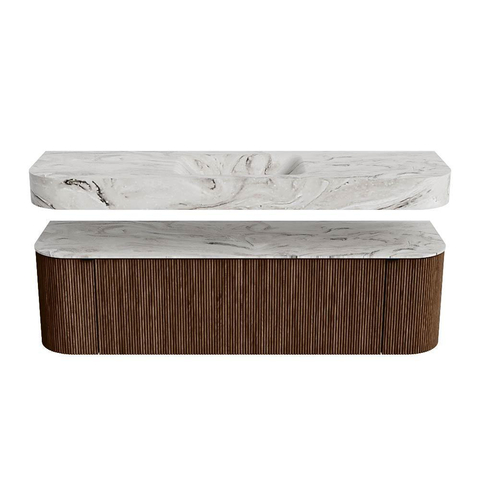 MONDIAZ THOR-DLUX Meuble de salle de bains 160cm arrondi gauche + droite couleur Walnut avec 1 tiroir et 2 portes. Vasque suspendue CLOUD Milieu sans trou de robinet couleur Glace.