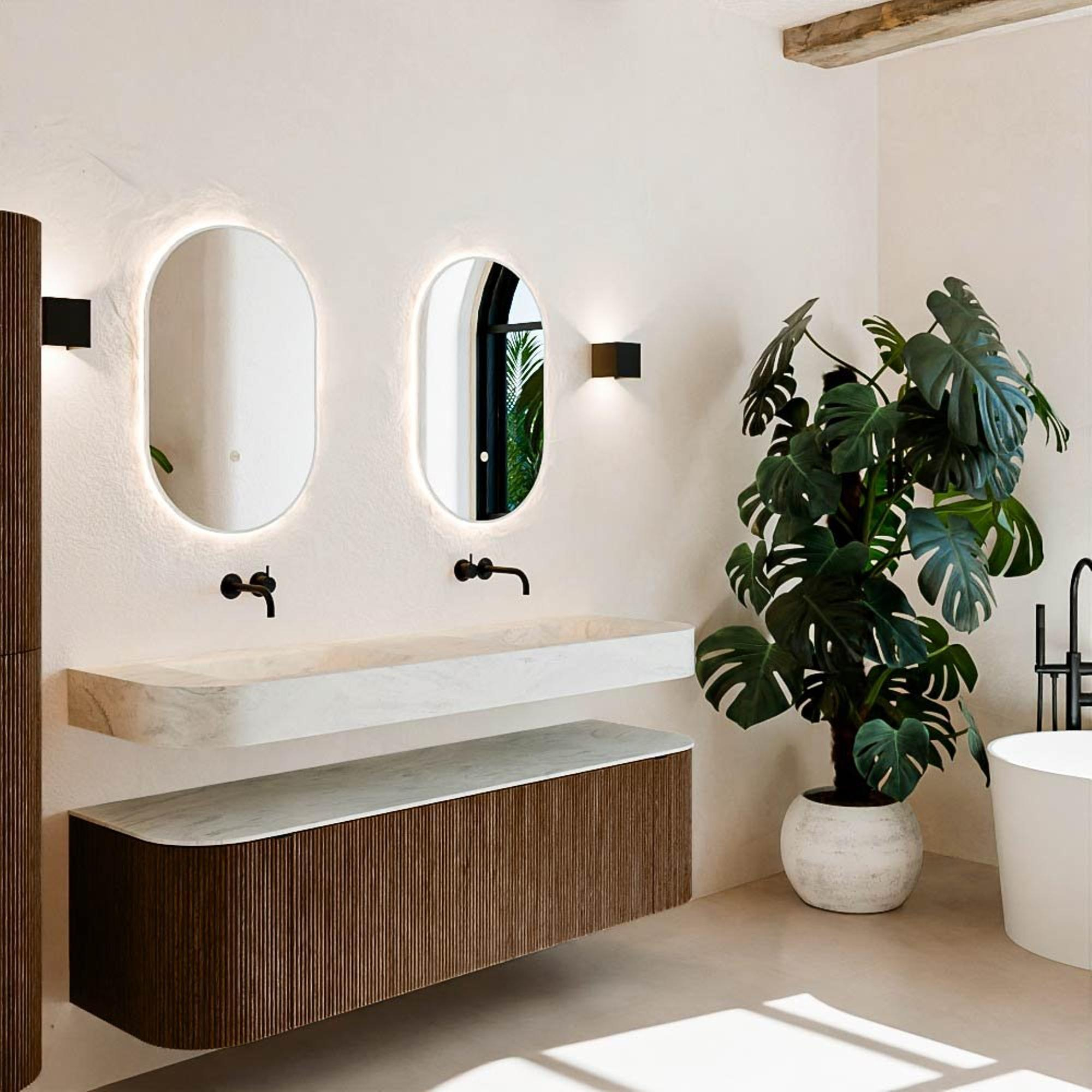 Matériaux naturels dans des tons chauds. Les nervures verticales apportent rythme et texture au design, tandis que le chêne confère une apparence chaleureuse et artisanale. Choisissez parmi 5 teintes de bois OAK, WALNUT, DUSK, SHADOW et RUBY, des couleurs de bois soigneusement sélectionnées pour enrichir les salles de bains modernes et classiques.
