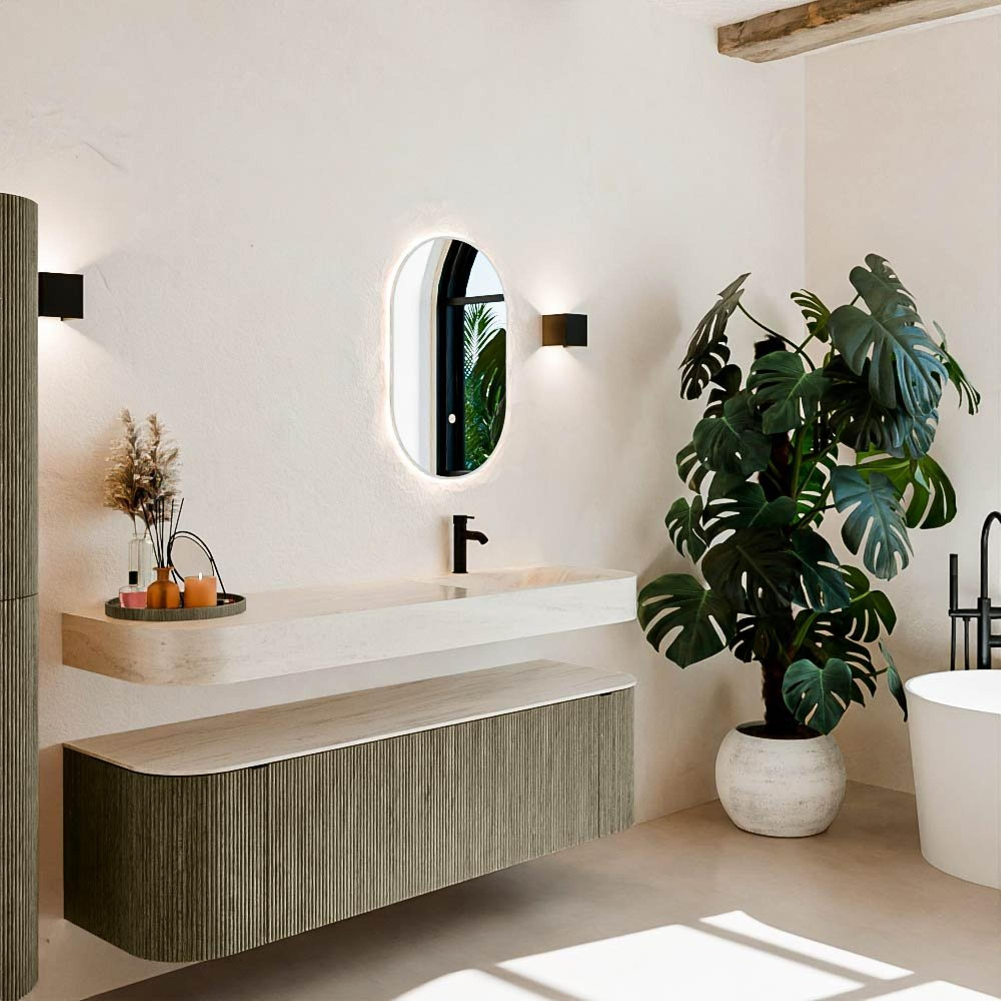 Matériaux naturels dans des tons chauds. Les nervures verticales apportent rythme et texture au design, tandis que le chêne confère une apparence chaleureuse et artisanale. Choisissez parmi 5 teintes de bois OAK, WALNUT, DUSK, SHADOW et RUBY, des couleurs de bois soigneusement sélectionnées pour enrichir les salles de bains modernes et classiques.
