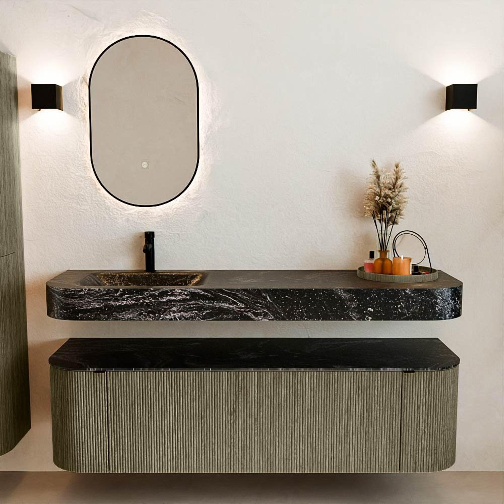 MONDIAZ THOR-DLUX 160cm meuble de salle de bains arrondi gauche + droite couleur Shadow avec 1 tiroir et 2 portes. Vasque suspendue CLOUD Gauche 1 trou de robinet couleur Lava.