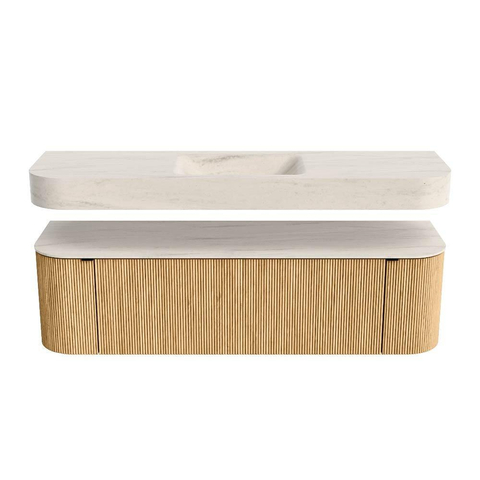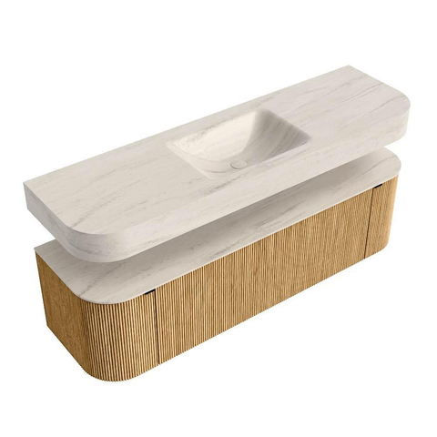 MONDIAZ THOR-DLUX 160cm meuble de salle de bains arrondi gauche + droite couleur Oak avec 1 tiroir et 2 portes. Vasque suspendue CLOUD Milieu 1 trou de robinet couleur Meli.
