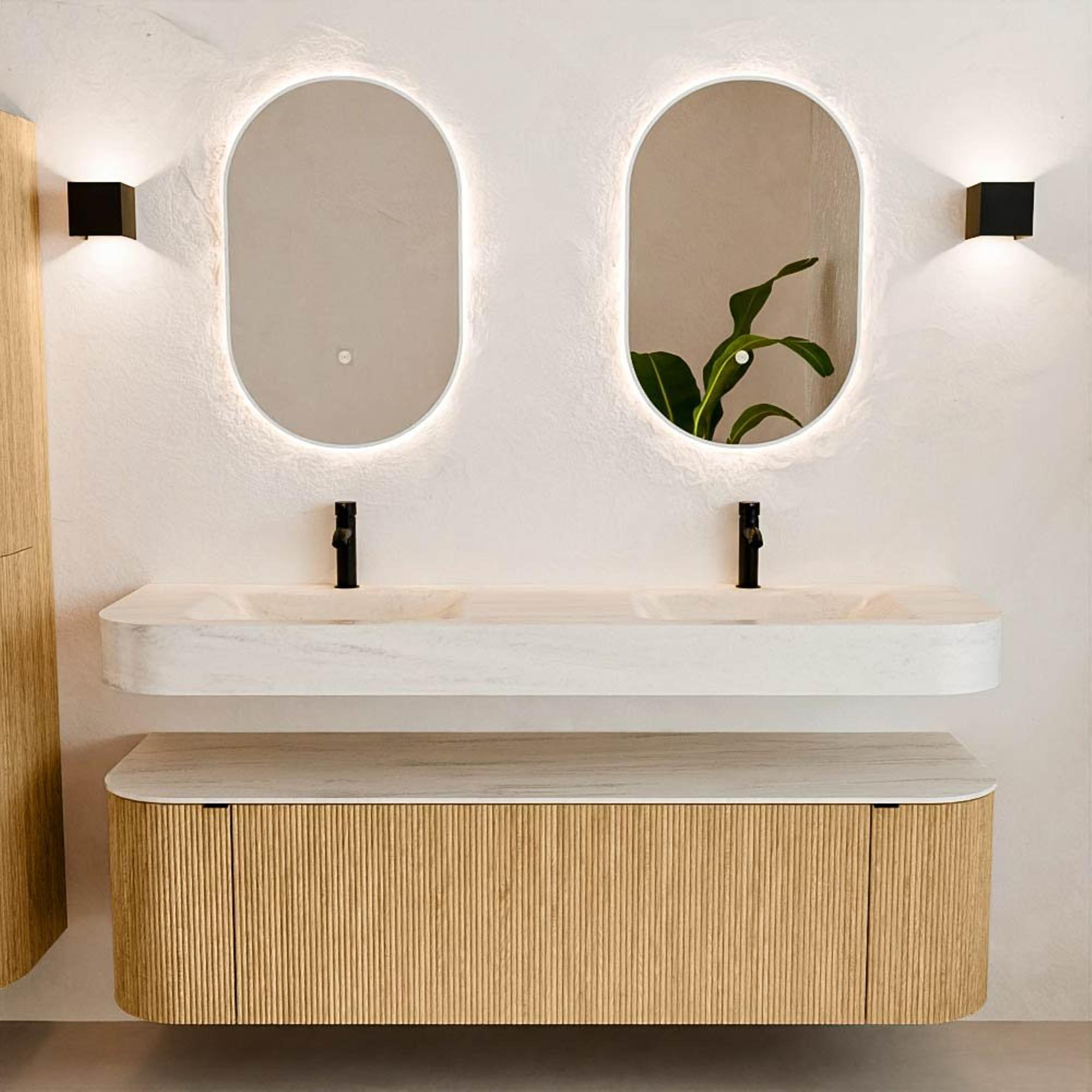 MONDIAZ THOR-DLUX 160cm meuble de salle de bains arrondi gauche + droite couleur Oak avec 1 tiroir et 2 portes. Vasque suspendue CLOUD Double 2 trous de robinet couleur Meli.