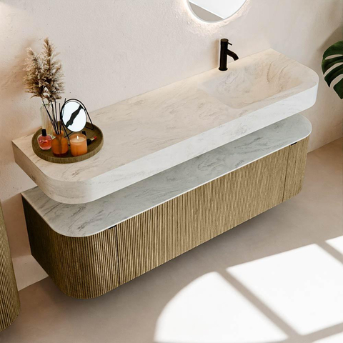 Au-dessus du meuble flotte une vasque suspendue assortie aux coins arrondis – parfaitement adaptée à la forme du meuble. La vasque est réalisée en Solid Surface et suit subtilement les lignes du meuble inférieur, créant ainsi un ensemble harmonieux. Le plan de travail en Solid Surface constitue une base solide, facile d'entretien, et complète la combinaison.