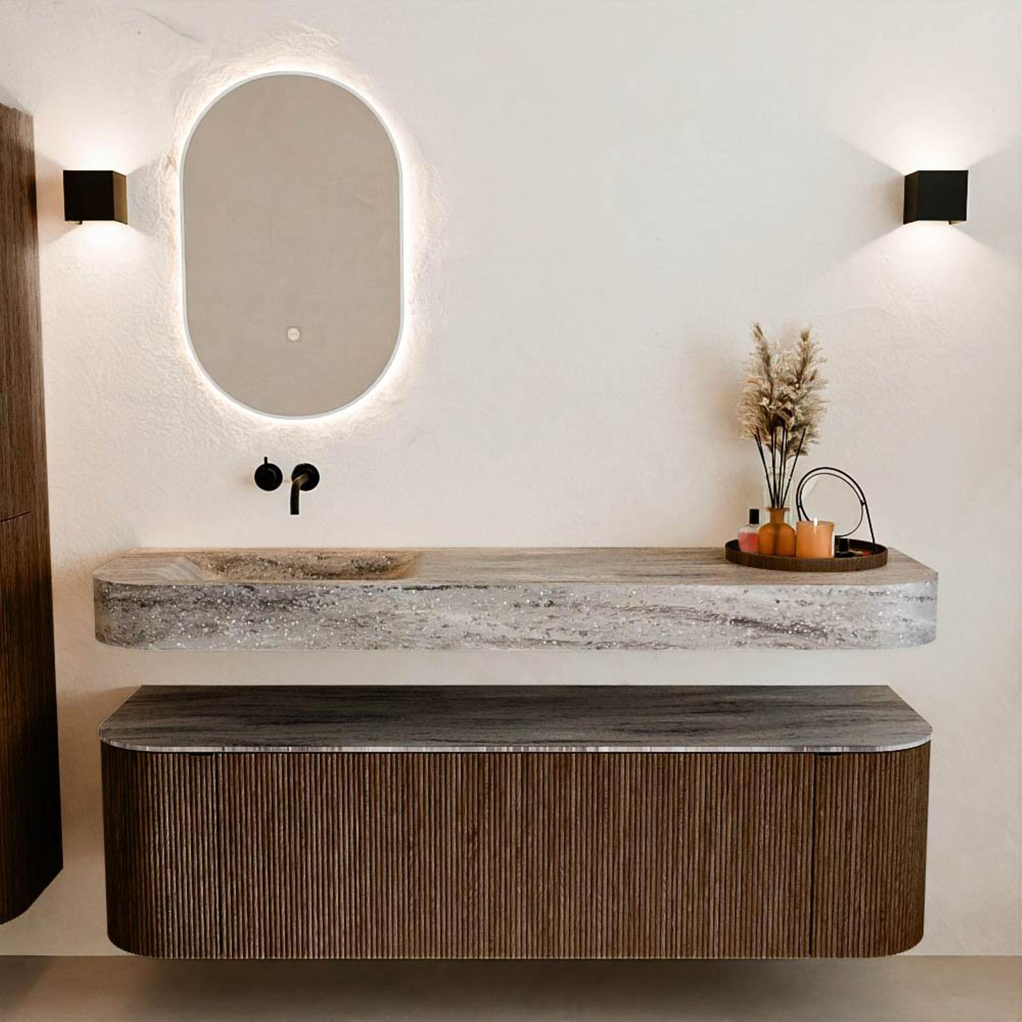 Au-dessus du meuble flotte une vasque suspendue assortie aux coins arrondis – parfaitement adaptée à la forme du meuble. La vasque est en Solid Surface et suit subtilement les lignes du meuble inférieur, créant un ensemble harmonieux. Le plan de travail en Solid Surface forme une base solide, facile d'entretien, complétant la combinaison.