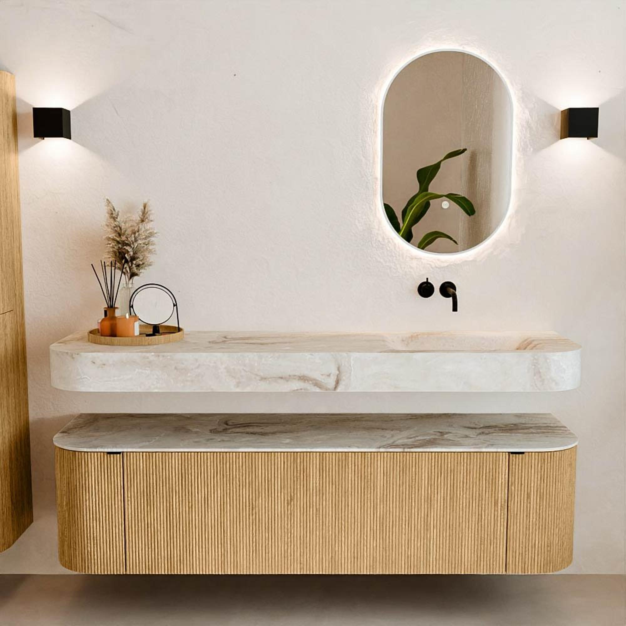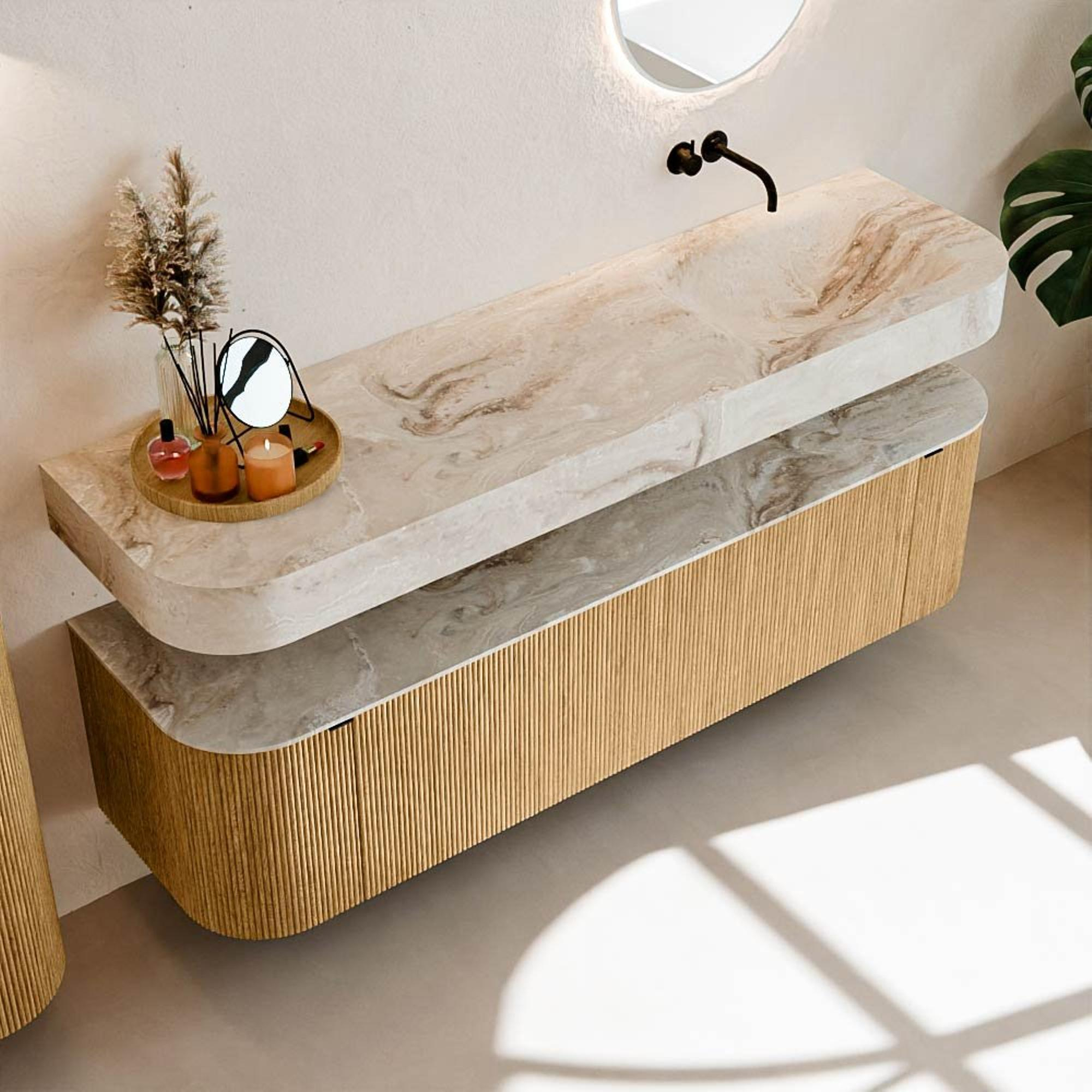 Au-dessus du meuble flotte une vasque suspendue assortie aux coins arrondis – parfaitement adaptée à la forme du meuble. La vasque est réalisée en Solid Surface et suit subtilement les lignes du meuble inférieur, créant ainsi un ensemble harmonieux. Le plan de travail en Solid Surface constitue une base solide et facile d’entretien, complétant la combinaison.