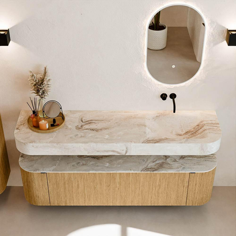 MONDIAZ THOR-DLUX Meuble de salle de bains 170cm arrondi gauche + droite couleur Oak avec 1 tiroir et 2 portes. Vasque suspendue CLOUD Droite sans trou de robinet couleur Frappe.
