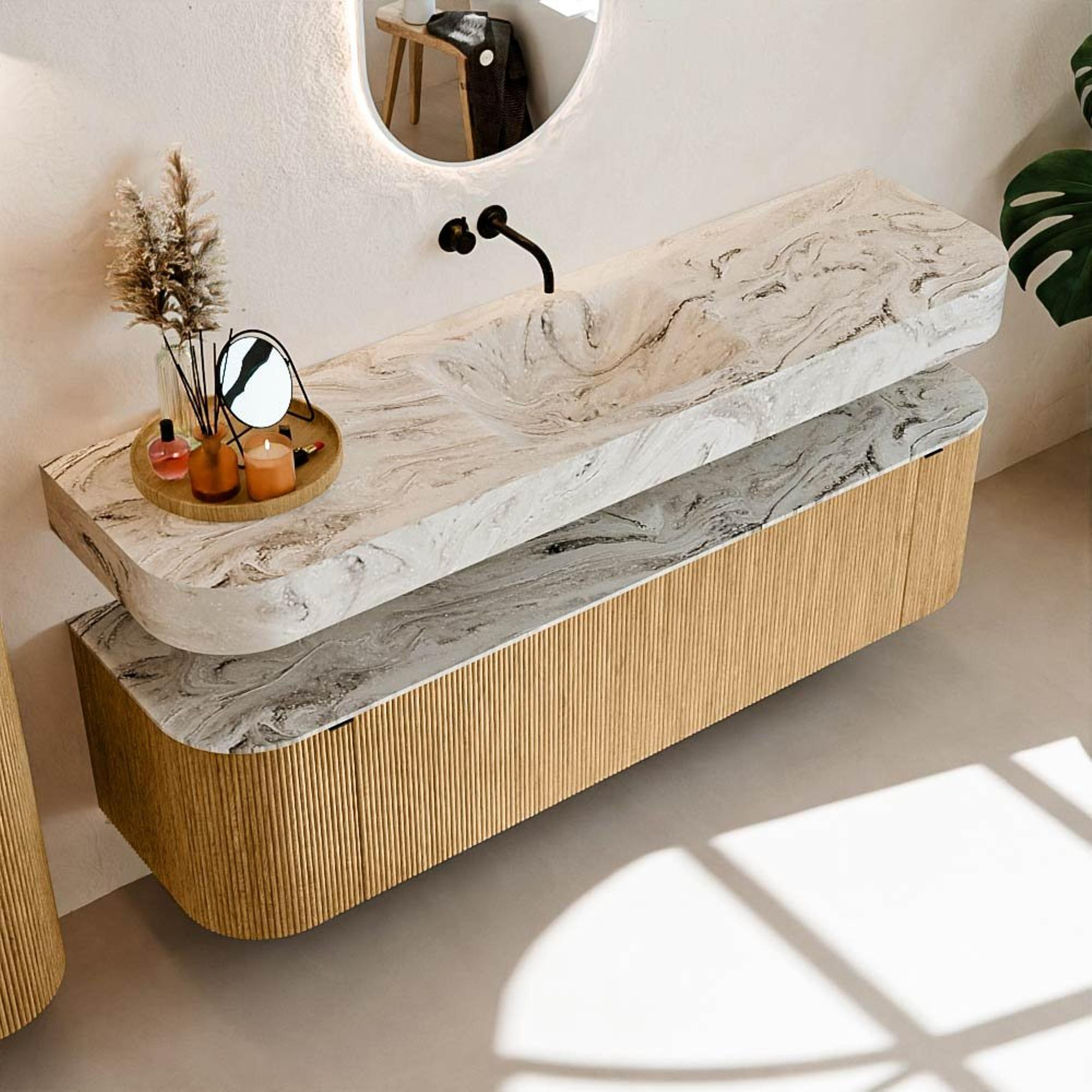 Au-dessus du meuble flotte une vasque suspendue assortie aux coins arrondis – parfaitement adaptée à la forme du meuble. La vasque est réalisée en Solid Surface et suit subtilement les lignes du meuble inférieur, créant ainsi un ensemble harmonieux. Le plan de travail en Solid Surface forme une base solide et facile d'entretien et complète la combinaison.