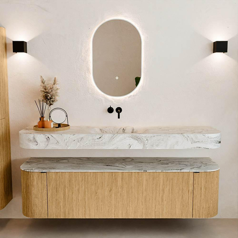 Matériaux naturels dans des tons chauds. Les rainures verticales apportent rythme et texture au design, tandis que le chêne confère une apparence chaleureuse et artisanale. Choisissez parmi 5 teintes de bois OAK, WALNUT, DUSK, SHADOW et RUBY, des couleurs de bois soigneusement sélectionnées pour enrichir les salles de bains modernes et classiques.