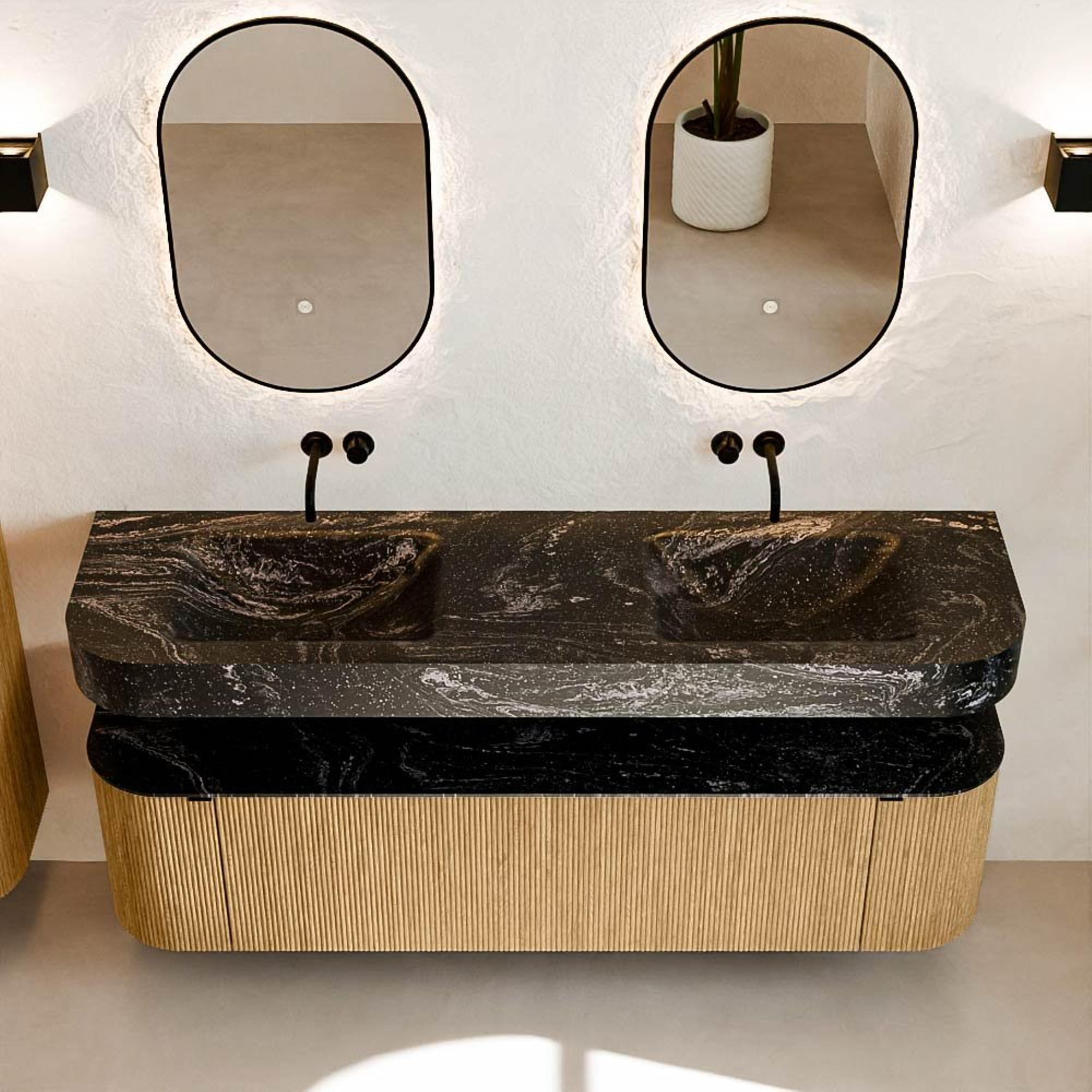 MONDIAZ THOR-DLUX Meuble de salle de bains - 170cm - arrondi gauche + droite - couleur Oak - 1 tiroir et 2 portes - Vasque suspendue CLOUD Double sans trou de robinet - couleur Lava