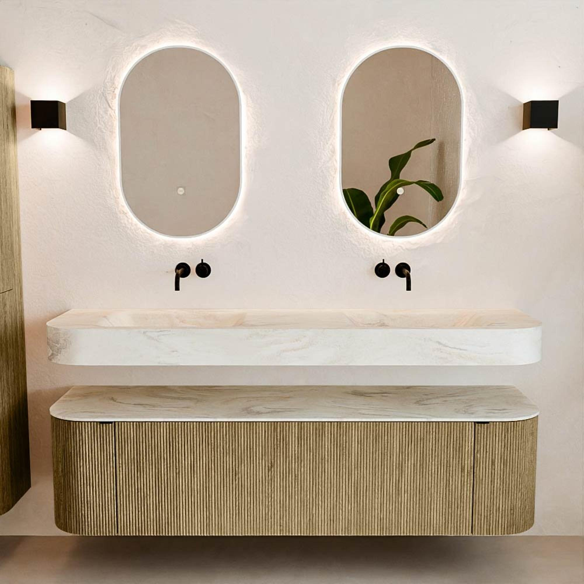 Matériaux naturels aux teintes chaudes. Les nervures verticales apportent rythme et texture au design, tandis que le chêne confère une apparence chaleureuse et artisanale. Choisissez parmi 5 teintes de bois OAK, WALNUT, DUSK, SHADOW et RUBY, des couleurs de bois soigneusement sélectionnées pour enrichir les salles de bains modernes et classiques.