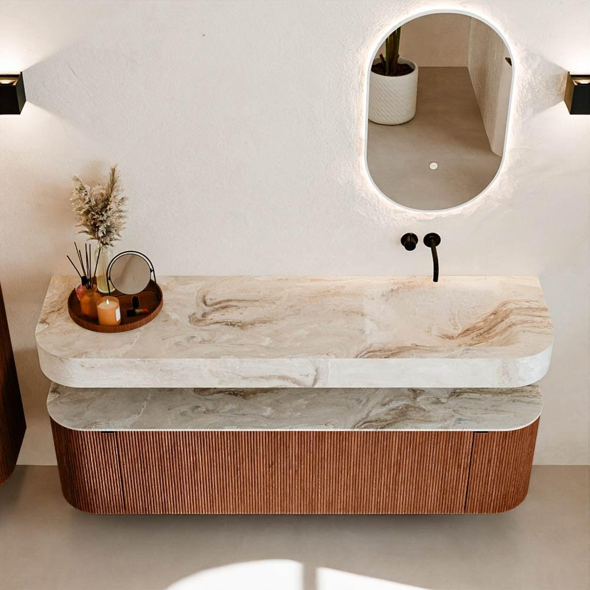 Matériaux naturels dans des tons chauds. Les nervures verticales apportent rythme et texture au design, tandis que le chêne confère une apparence chaleureuse et artisanale. Choisissez parmi 5 teintes de bois OAK, WALNUT, DUSK, SHADOW et RUBY, des couleurs de bois soigneusement sélectionnées pour enrichir les salles de bains modernes et classiques.