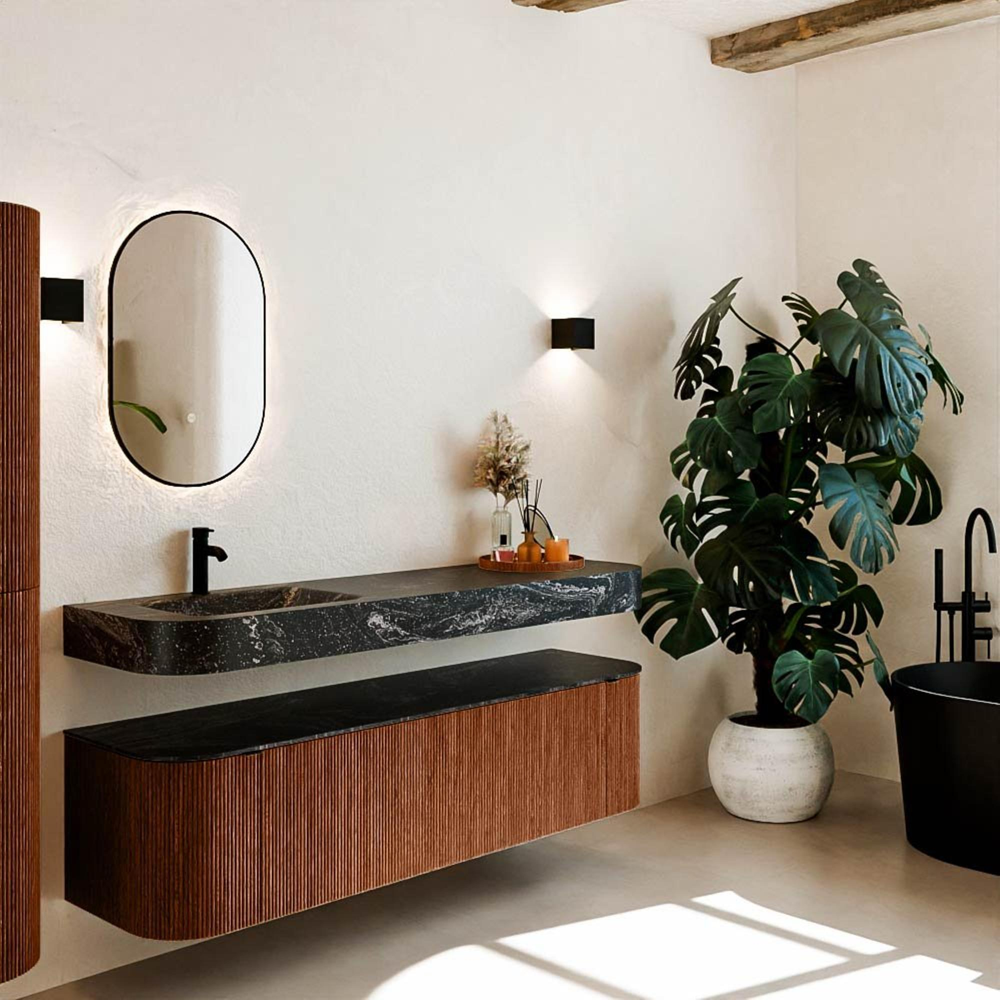 Matériaux naturels dans des tons chauds. Les rainures verticales apportent rythme et texture au design, tandis que le chêne confère une apparence chaleureuse et artisanale. Choisissez parmi 5 teintes de bois OAK, WALNUT, DUSK, SHADOW et RUBY, des couleurs de bois soigneusement sélectionnées pour enrichir les salles de bains modernes et classiques.