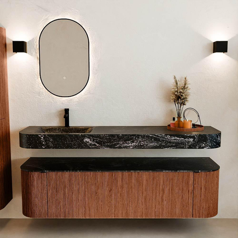 Au-dessus du meuble flotte une vasque suspendue assortie aux coins arrondis – parfaitement adaptée à la forme du meuble. La vasque est réalisée en Solid Surface et suit subtilement les lignes du meuble inférieur, créant une harmonie complète. Le plan de travail en Solid Surface constitue une base solide et facile d'entretien, complétant l'ensemble.
